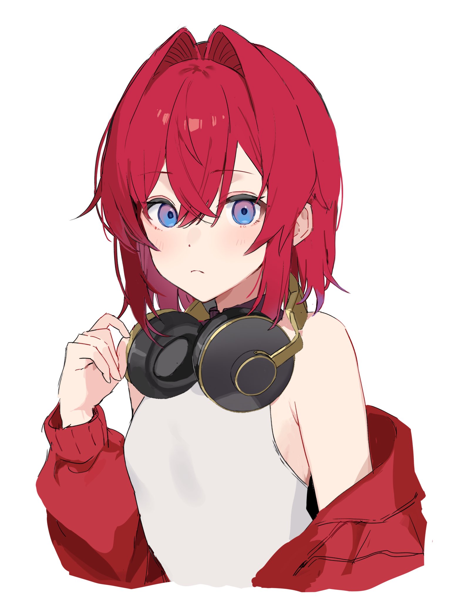1girl ange_katrina ange_katrina_(1st_costume) armpit_crease bare_shoulders blue_eyes blush breasts cardigan closed_mouth cropped_torso crossed_bangs frown gradient_eyes hair_between_eyes hair_intakes hand_up happachan2do6 headphones headphones_around_neck highres long_sleeves looking_at_viewer medium_hair multicolored_eyes nijisanji off_shoulder open_cardigan open_clothes purple_eyes red_cardigan red_hair shirt simple_background sleeveless sleeveless_shirt small_breasts solo virtual_youtuber white_background white_shirt