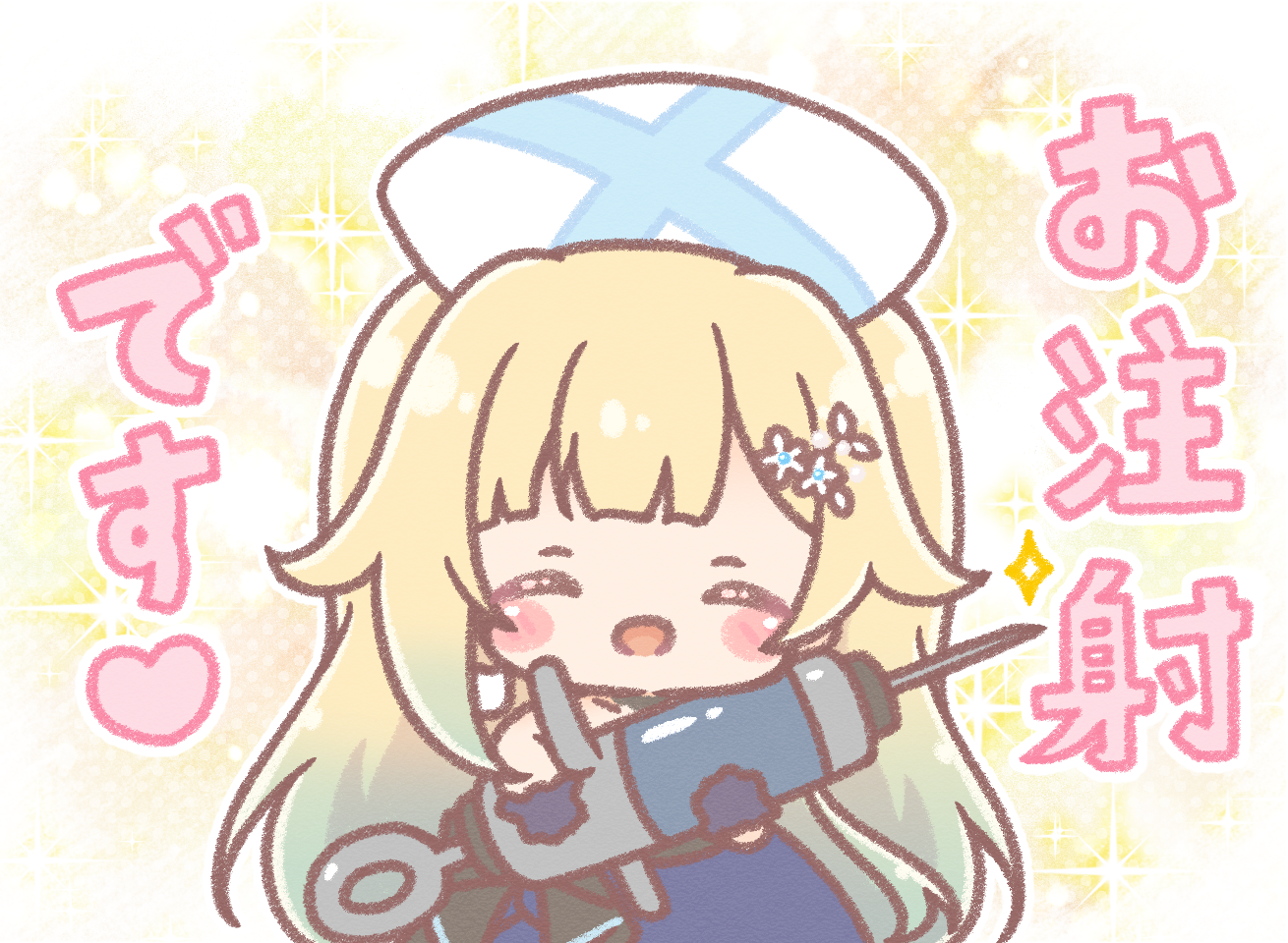 1girl :d ^_^ aizawa_ema blonde_hair blue_dress blue_gloves blush_stickers chibi closed_eyes commentary_request dress facing_viewer flower gloves gradient_hair green_hair hair_flower hair_ornament hat holding holding_syringe long_hair mitarashi_neko multicolored_hair nurse_cap open_mouth smile solo sparkle_background syringe translation_request very_long_hair virtual_youtuber vspo! white_flower white_hat