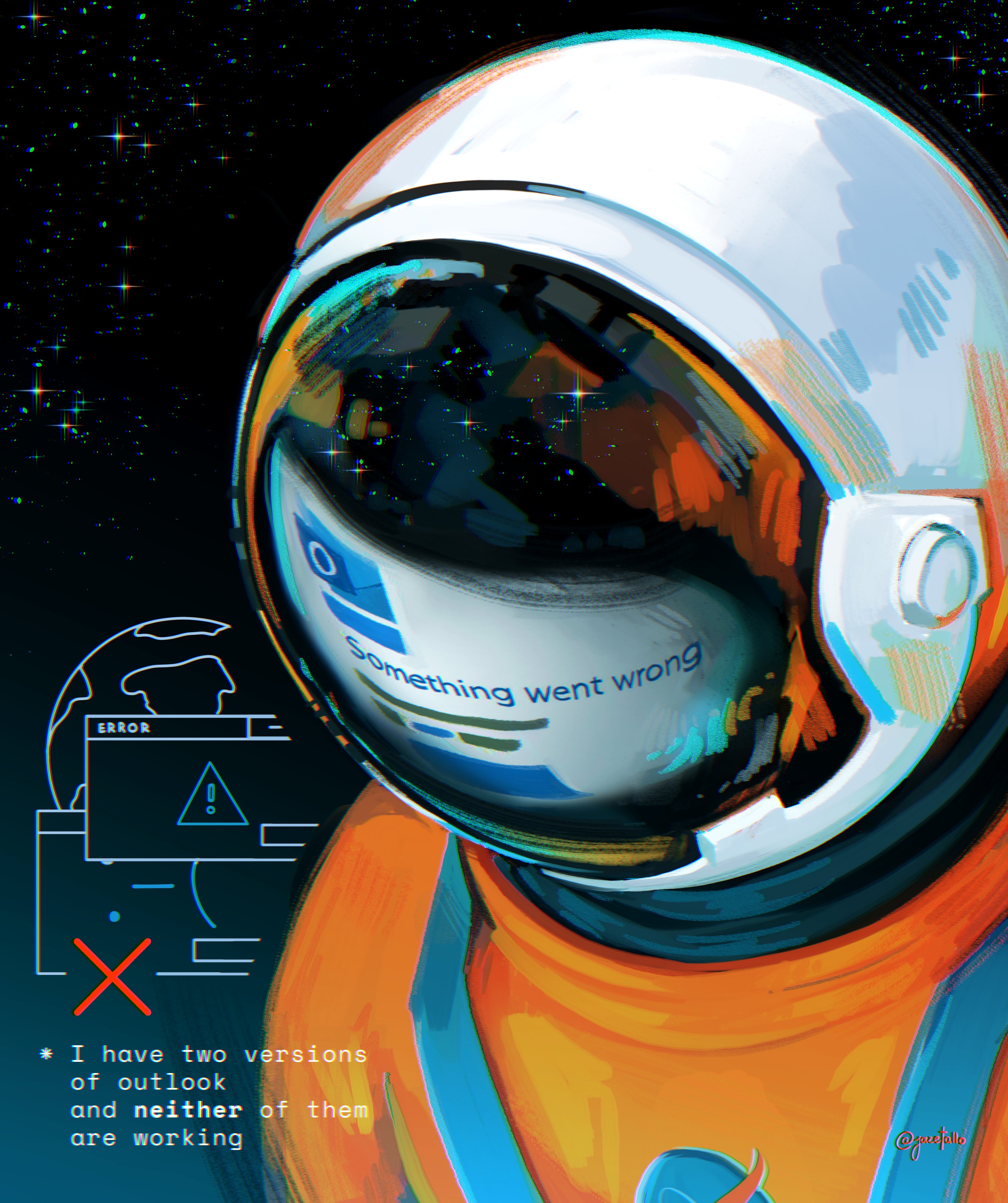 1other absurdres artemis_ii artemis_program astronaut commentary english_commentary english_text error_message formal_clothes helmet highres logo microsoft_outlook monitor nasa nasa_logo orange_suit original reflection space space_helmet spacesuit star_(sky) suit white_helmet x_(symbol) zero_gravity