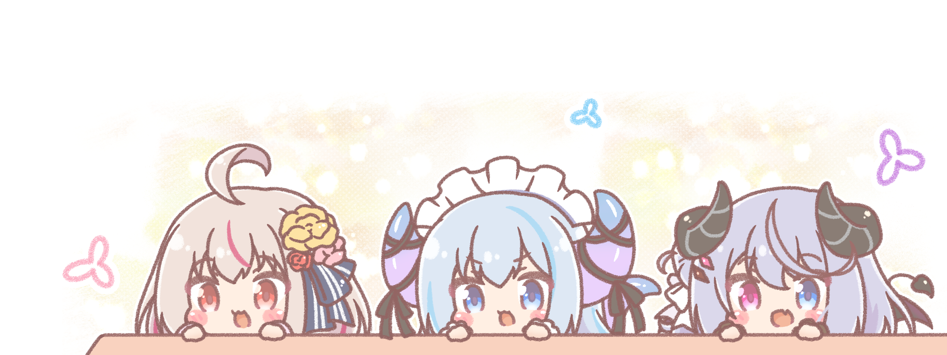 3girls absurdres ahoge black_wings blue_eyes blue_hair blush_stickers brown_hair chibi commentary_request demon_girl demon_horns demon_tail demon_wings dragon_girl dragon_horns dragon_tail flower grey_hair haconect hair_flower hair_ornament hands_up heterochromia highres horns maid_headdress mitarashi_neko multicolored_hair multiple_girls nanairo_temari peeking_out pink_flower purple_eyes purple_hair red_eyes red_flower streaked_hair tail tanaka_ryuko virtual_youtuber wings yellow_flower yorumu_ruku