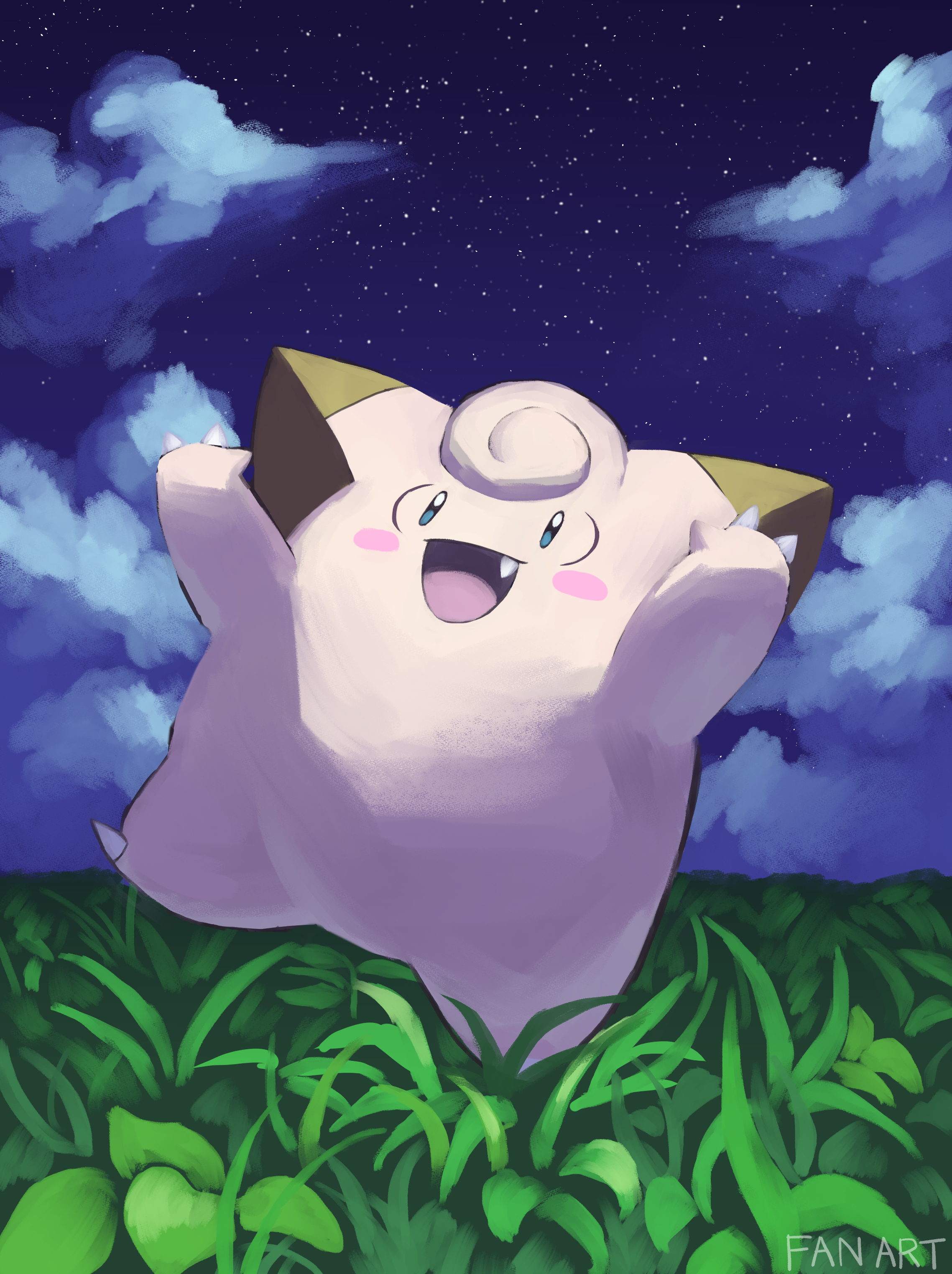 :d absurdres clefairy fang gen_1_pokemon highres jira_(ziraiya26) looking_up night nintendo no_humans open_mouth outdoors pokemon pokemon_(creature) pokemon_focus sky smile solo standing standing_on_one_leg star_(sky) starry_sky