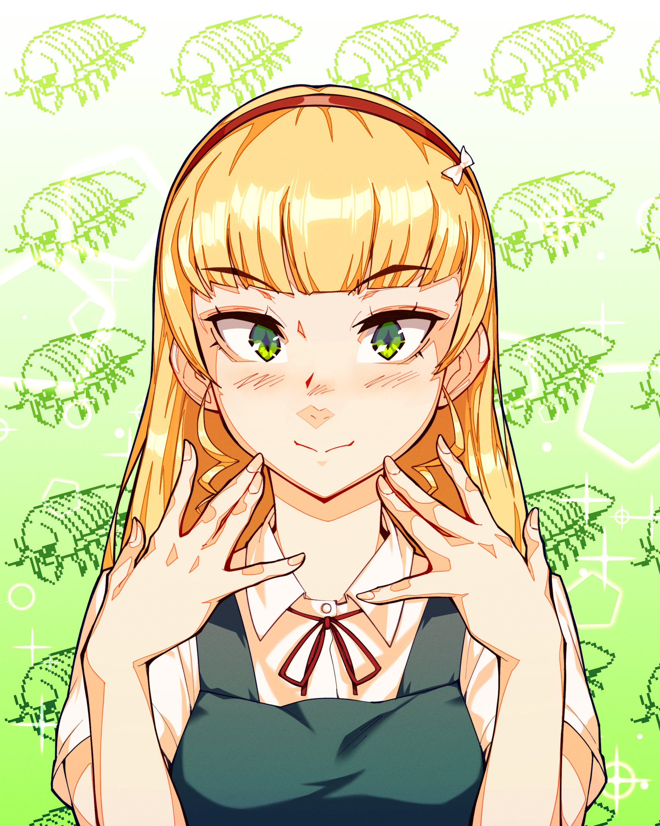 1girl absurdres blonde_hair blue_dress commentary dress english_commentary giant_isopod gradient_background green_eyes hairband heanna_sumire highres light_blush love_live! love_live!_superstar!! neck_ribbon red_hairband red_ribbon ribbon school_uniform shirt smile solo sparkle summer_uniform toadsterz white_shirt yuigaoka_school_uniform