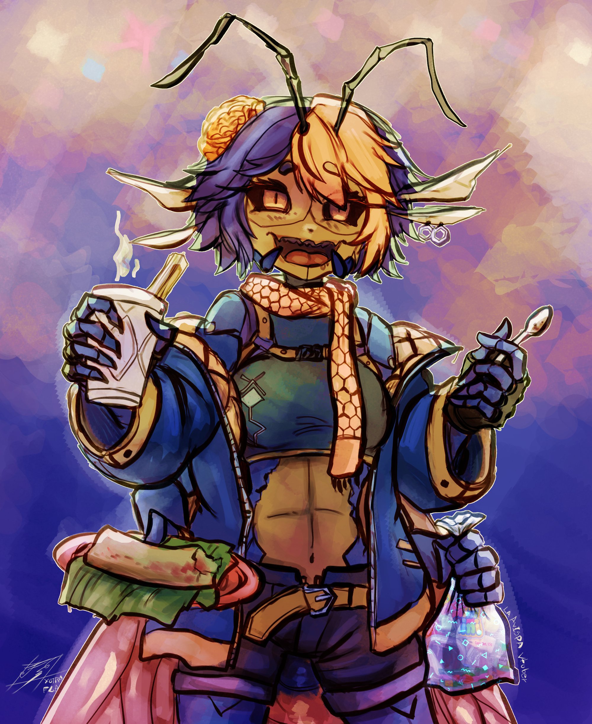 abs absurdres antennae arthropod_girl avispa_nectarinia bag belt black_hair black_jacket black_sclera black_shorts black_sports_bra blonde_hair burrito chest_strap colored_sclera cup extra_arms flower food hair_flower hair_ornament highres holding holding_bag holding_cup holding_food holding_spoon honeycomb_(pattern) indie_virtual_youtuber insect_wings jacket mandibles midriff multicolored_hair navel open_clothes open_jacket scarf shorts signature smile spoon sports_bra steaming_food two-tone_hair virtual_youtuber wasp_girl watercolor_background wings xtorafga yellow_belt yellow_eyes yellow_flower