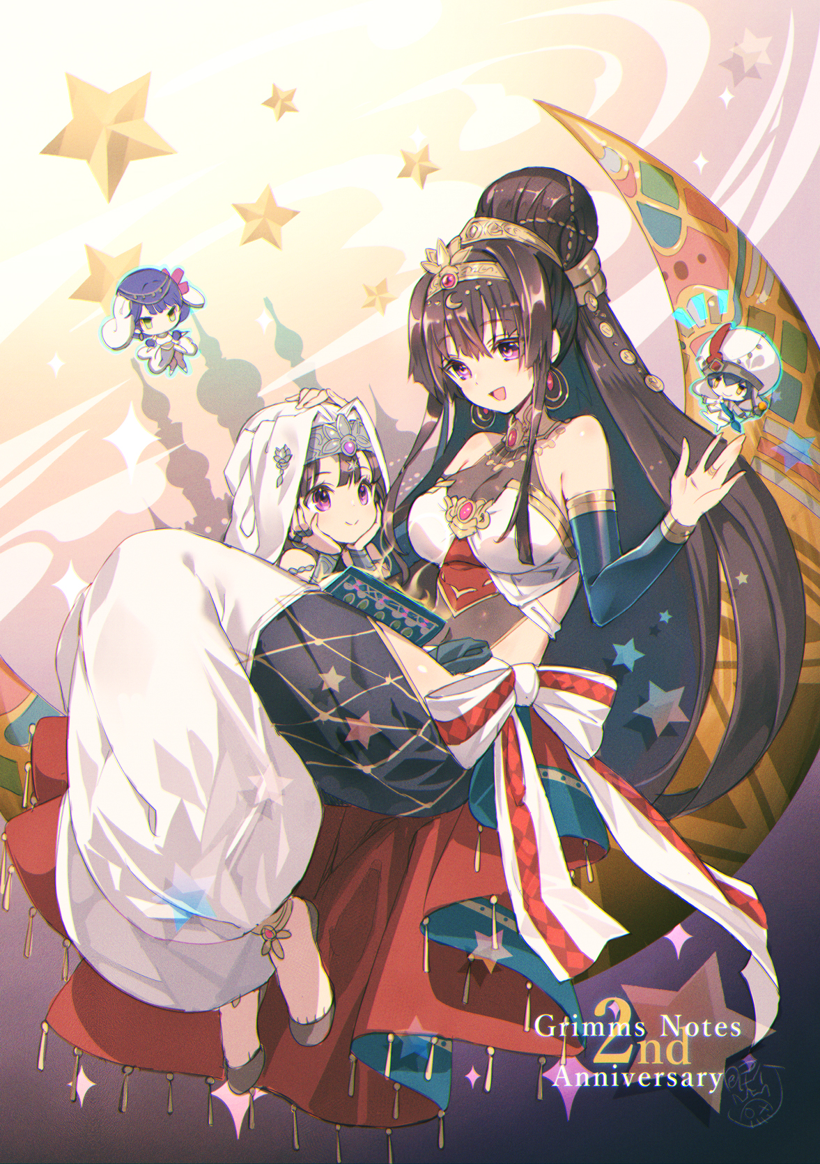 1boy 3girls aladdin_(grimms_notes) aladdin_(koutei)_(grimms_notes) anniversary arabian_clothes black_hair breasts brown_hair chaos_badour_(grimms_notes) chibi cleavage dunyazad_(grimms_notes) floating gem gold_tiara grimms_notes hair_ornament hand_on_another's_head harem_pants head_rest highres holding holding_staff large_breasts mini_person miniboy minigirl multiple_girls nemusuke open_mouth pants pink_gem purple_eyes purple_hair scheherazade_(grimms_notes) smile staff star_(symbol) veil white_veil yellow_eyes