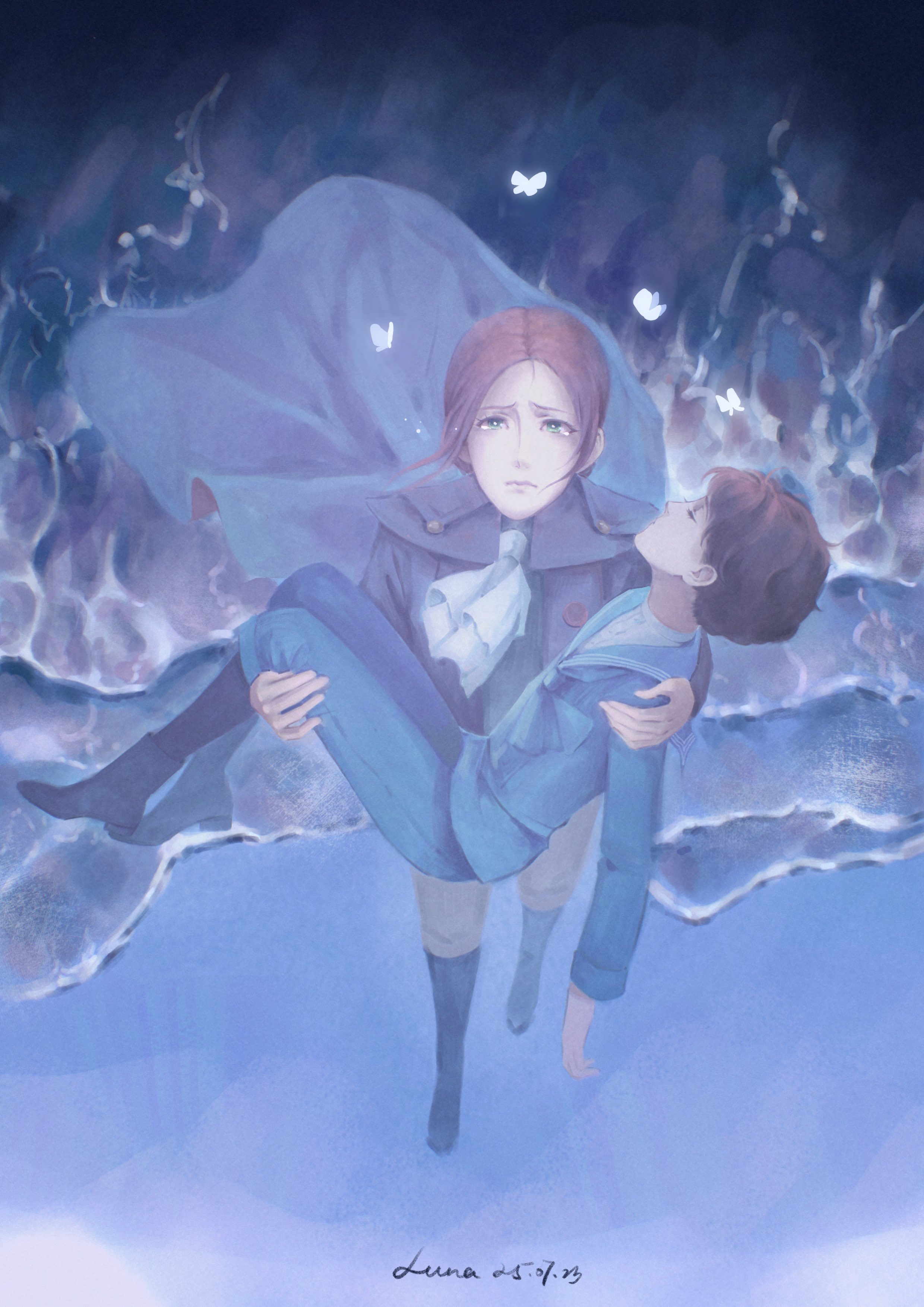 1boy 1girl absurdres ascot black_boots black_coat blue_pants blue_shirt boots brown_hair bug butterfly cape carlo_(lies_of_p) carrying carrying_person closed_mouth coat commentary dated english_commentary from_above furrowed_brow green_eyes highres insect lea_florence_monad lies_of_p lies_of_p:_overture moonlitmelody pants red_hair sad shirt walking water white_ascot white_butterfly
