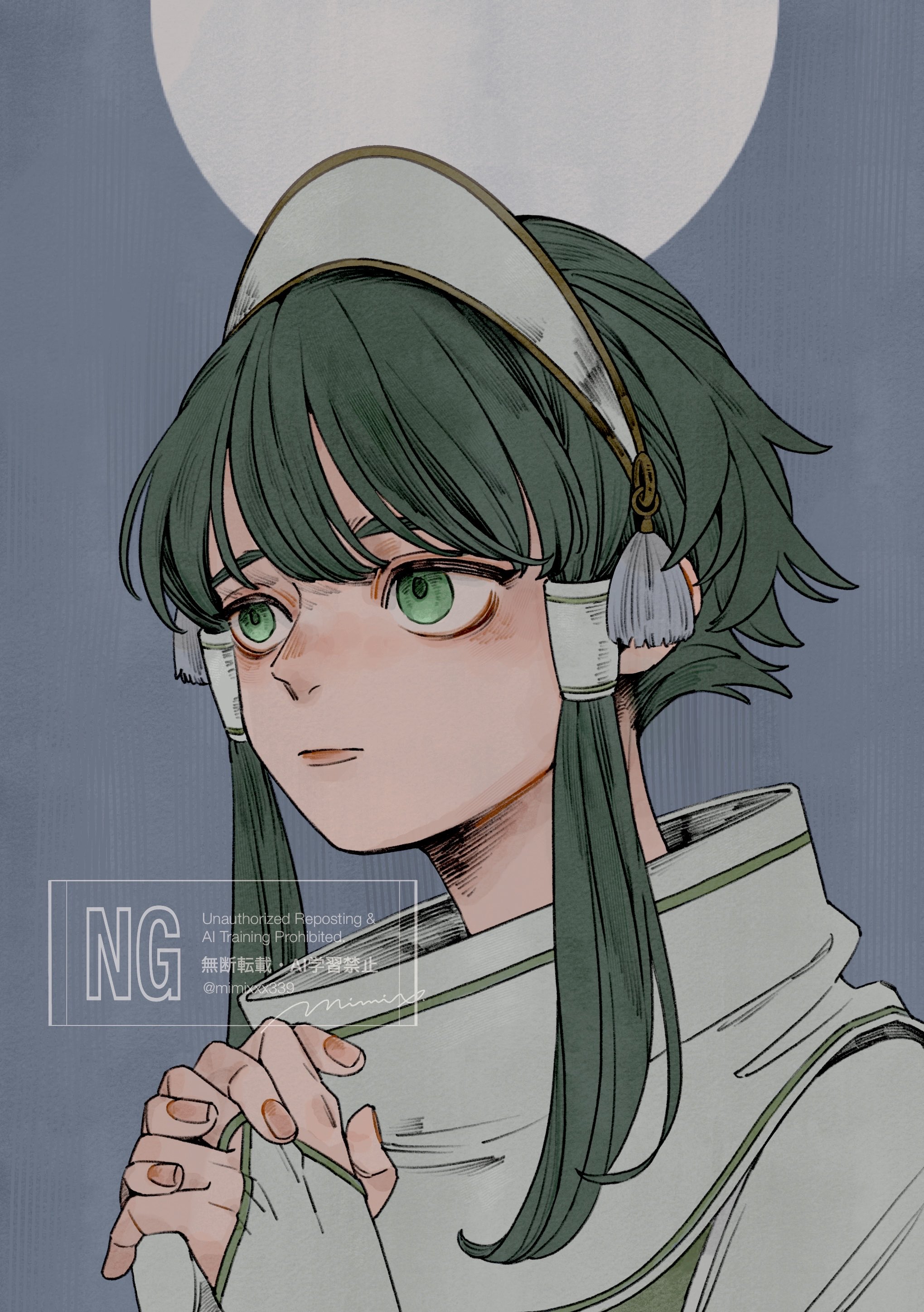 1boy absurdres androgynous closed_mouth commentary_request green_eyes green_trim grey_background hair_tubes highres ion_(tales) long_hair looking_ahead male_focus mimixxx339 own_hands_clasped own_hands_together robe solo tales_of_(series) tales_of_the_abyss tassel watermark white_robe