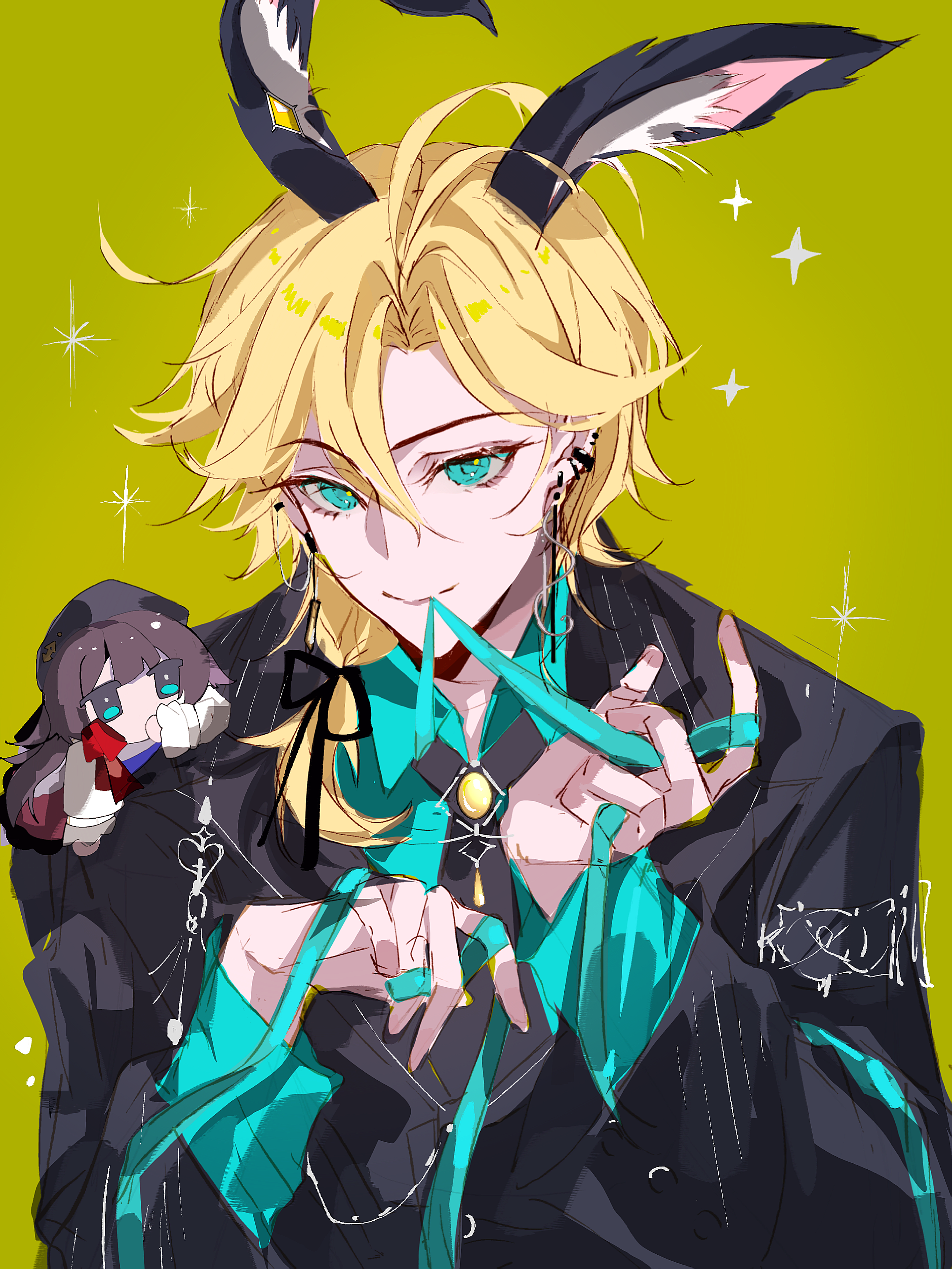 11211t 1boy 1girl absurdres animal_ears antenna_hair aqua_eyes aqua_ribbon aqua_shirt black_jacket black_necktie black_ribbon blonde_hair brooch chibi_on_shoulder chinese_commentary closed_mouth collared_shirt commentary_request curtained_hair ear_chain ear_piercing earrings extra_ears gem green_background hair_between_eyes hair_ribbon heroine_(lovebrush_chronicles) highres holding holding_ribbon jacket jewelry kemonomimi_mode lars_rorschach lars_rorschach_(bejeweled_heart) linked_piercing long_sleeves looking_at_viewer lovebrush_chronicles low_ponytail male_focus medium_hair mini_person minigirl mismatched_earrings mouth_hold necktie piercing ponytail rabbit_boy rabbit_ears ribbon ribbon_in_mouth shirt simple_background smile solo_focus suit_jacket upper_body yellow_gem
