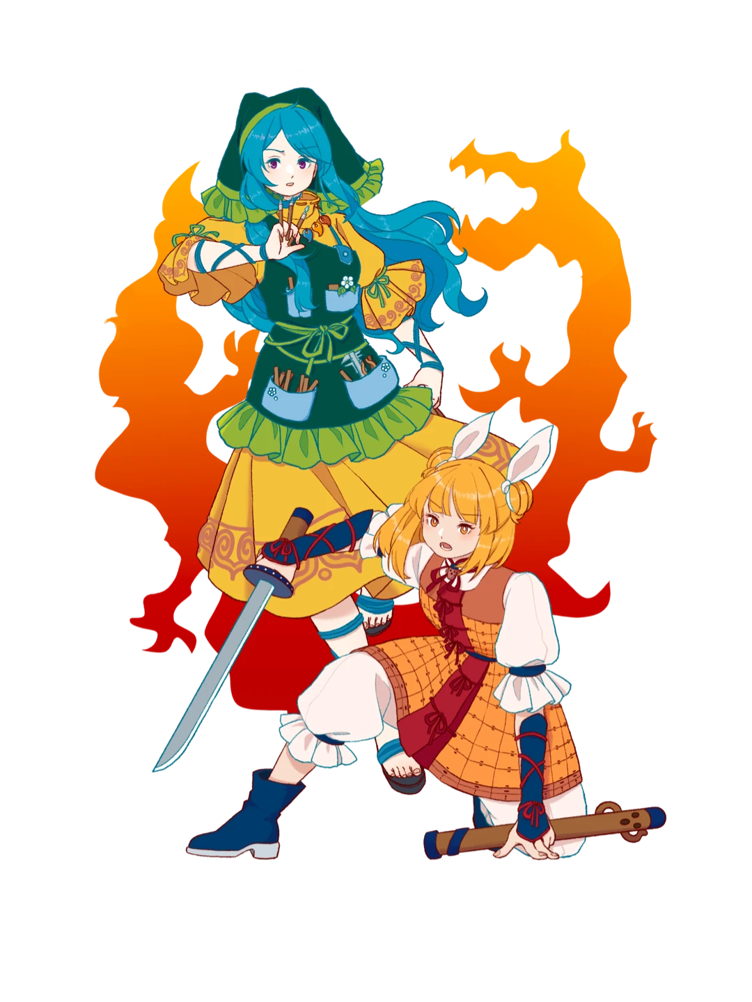 2girls aqua_hair blonde_hair commentary_request fire full_body haniyasushin_keiki highres holding holding_sheath holding_sword holding_weapon joutouguu_mayumi long_hair medium_hair multiple_girls purple_eyes sagasaga sheath sword touhou unsheathed weapon yellow_eyes