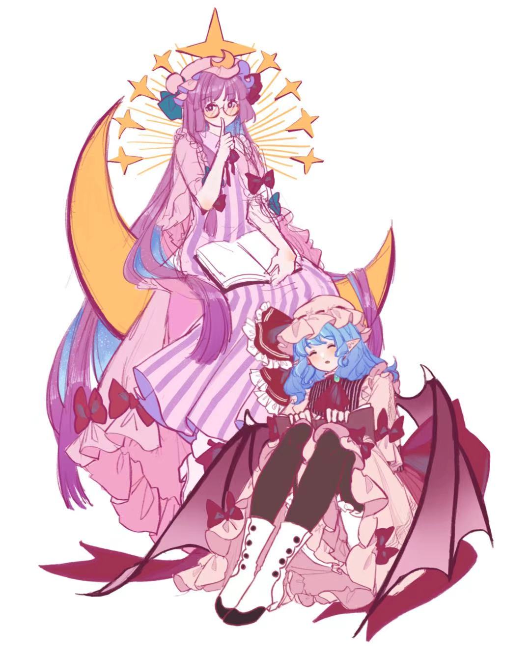 2girls ascot blue_hair book closed_eyes commentary_request crescent crescent_hat_ornament full_body glasses hat hat_ornament highres holding holding_book long_hair medium_hair mob_cap multiple_girls open_book patchouli_knowledge purple_eyes purple_hair red_ascot remilia_scarlet sagasaga touhou very_long_hair