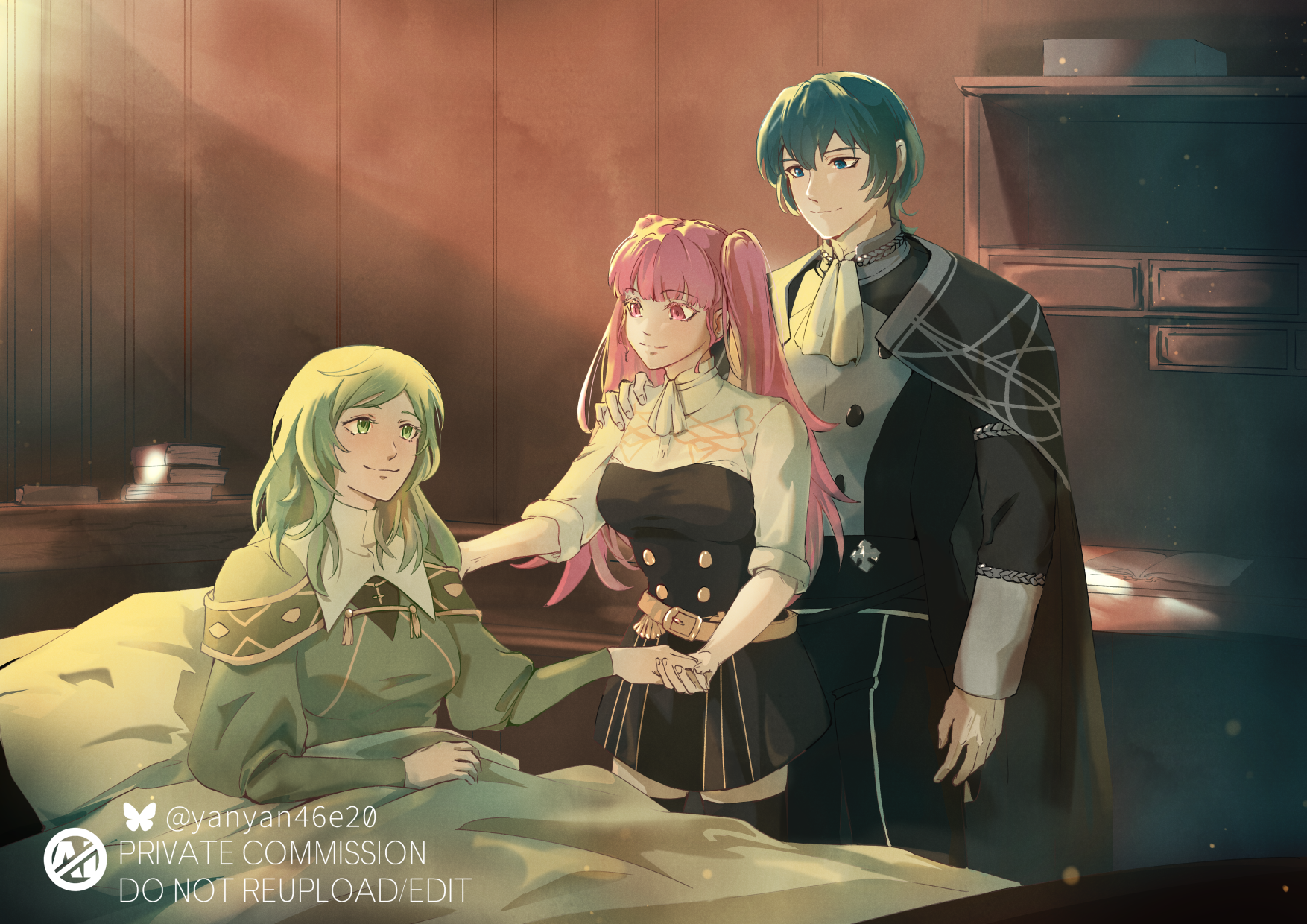 1boy 2girls alternate_universe artist_name bed_sheet belt blue_hair bluesky_username book book_stack breasts brown_belt commentary commission english_commentary fire_emblem fire_emblem:_three_houses garreg_mach_monastery_uniform green_eyes green_hair highres hilda_valentine_goneril holding_hands indoors long_hair long_sleeves male_byleth_(academy)_(fire_emblem) male_byleth_(fire_emblem) mother_and_child mother_and_son multiple_girls nintendo on_bed parent_and_child pillow pink_eyes pink_hair puffy_long_sleeves puffy_sleeves second-party_source short_hair sitri_eisner sitting smile standing twintails watermark yanyan46e20