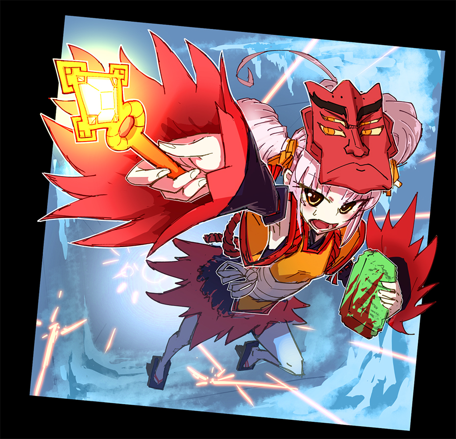1girl bare_shoulders black_border black_dress black_kimono black_sandals black_sleeves blood_on_object border commentary_request detached_sleeves dress drill_hair dutch_angle dynamic_pose geta glowing hair_ribbon holding holding_stone_tablet holding_wand jacket japanese_clothes kimono kimono_dress koko_nuts_(aponm) long_hair long_sleeves mask mask_on_head noita onikko_hunter_tsuina-chan open_mouth orange_eyes orange_jacket orange_ribbon perspective pink_hair red_dress red_mask red_rope red_sleeves red_trim ribbon rope running sandals sash shimenawa sleeveless sleeveless_dress solo stone_tablet tasuki tengu-geta tsuina-chan twin_drills two-tone_sleeves very_long_hair voiceroid wand white_sash wide_sleeves