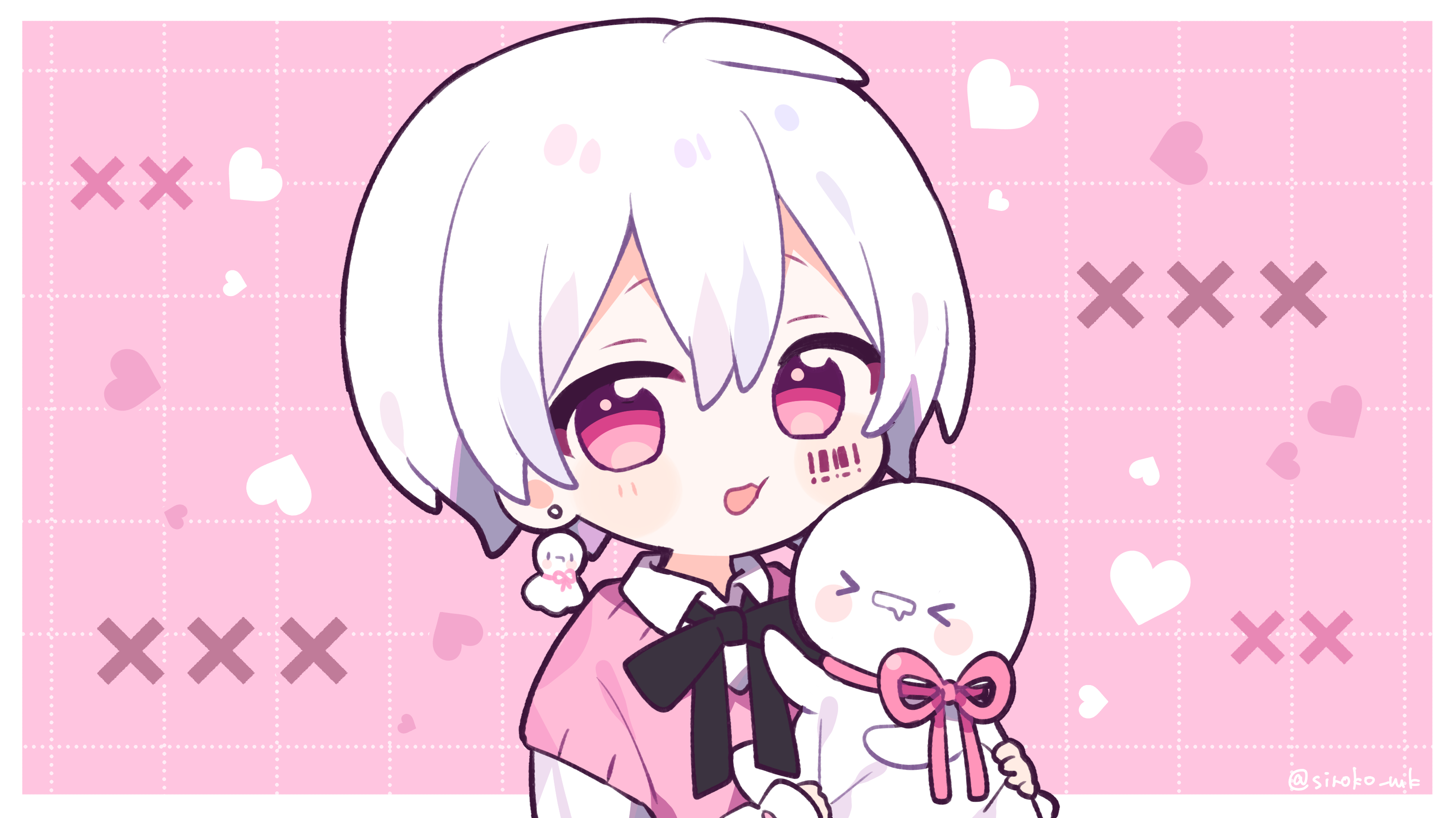 1boy :d absurdres barcode barcode_tattoo black_bow black_bowtie blush_stickers border bow bowtie chibi chibi_only collared_shirt commentary_request double-parted_bangs earrings fang grid_background hair_between_eyes heart highres indie_utaite jewelry looking_at_viewer mafumafu male_focus open_mouth outside_border pink_background pink_eyes pink_sweater_vest shiroko_(purinkirin) shirt short_hair skin_fang smile solo sweater_vest tattoo teruterubouzu twitter_username upper_body utaite white_border white_hair white_shirt x_(symbol)