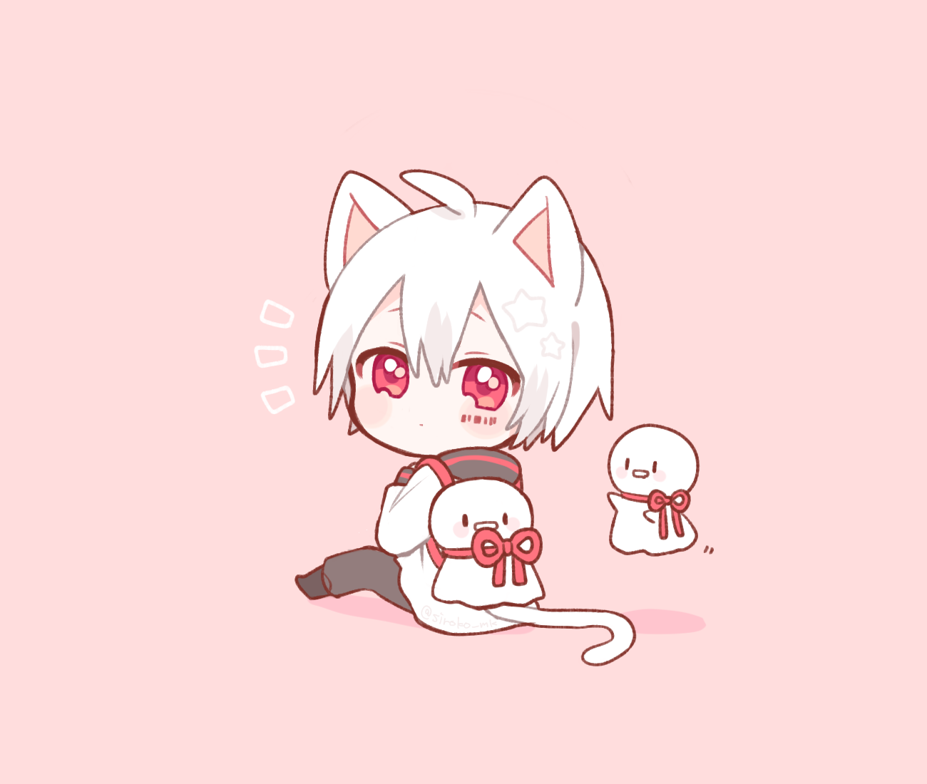 1boy ahoge animal_ears barcode barcode_tattoo black_boots black_pants blush_stickers boots cat_boy cat_ears cat_tail chibi chibi_only closed_mouth commentary_request double-parted_bangs full_body hair_between_eyes indie_utaite long_sleeves looking_at_viewer mafumafu male_focus notice_lines pants pink_background red_eyes shiroko_(purinkirin) shirt short_hair simple_background sitting solo star_(symbol) tail tattoo teruterubouzu utaite white_hair white_shirt