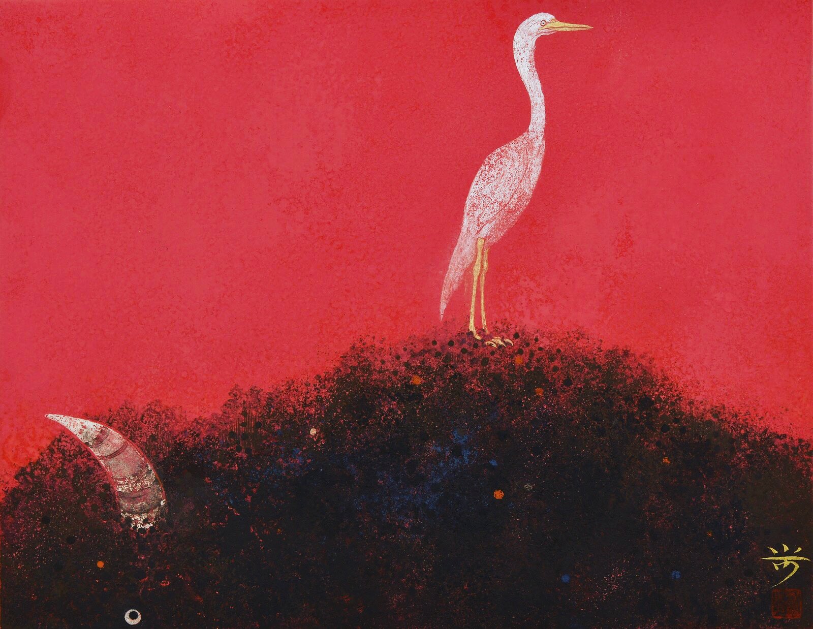 animal_focus animal_request bird bison commentary_request crane_(animal) damumun highres no_humans original red_background traditional_media