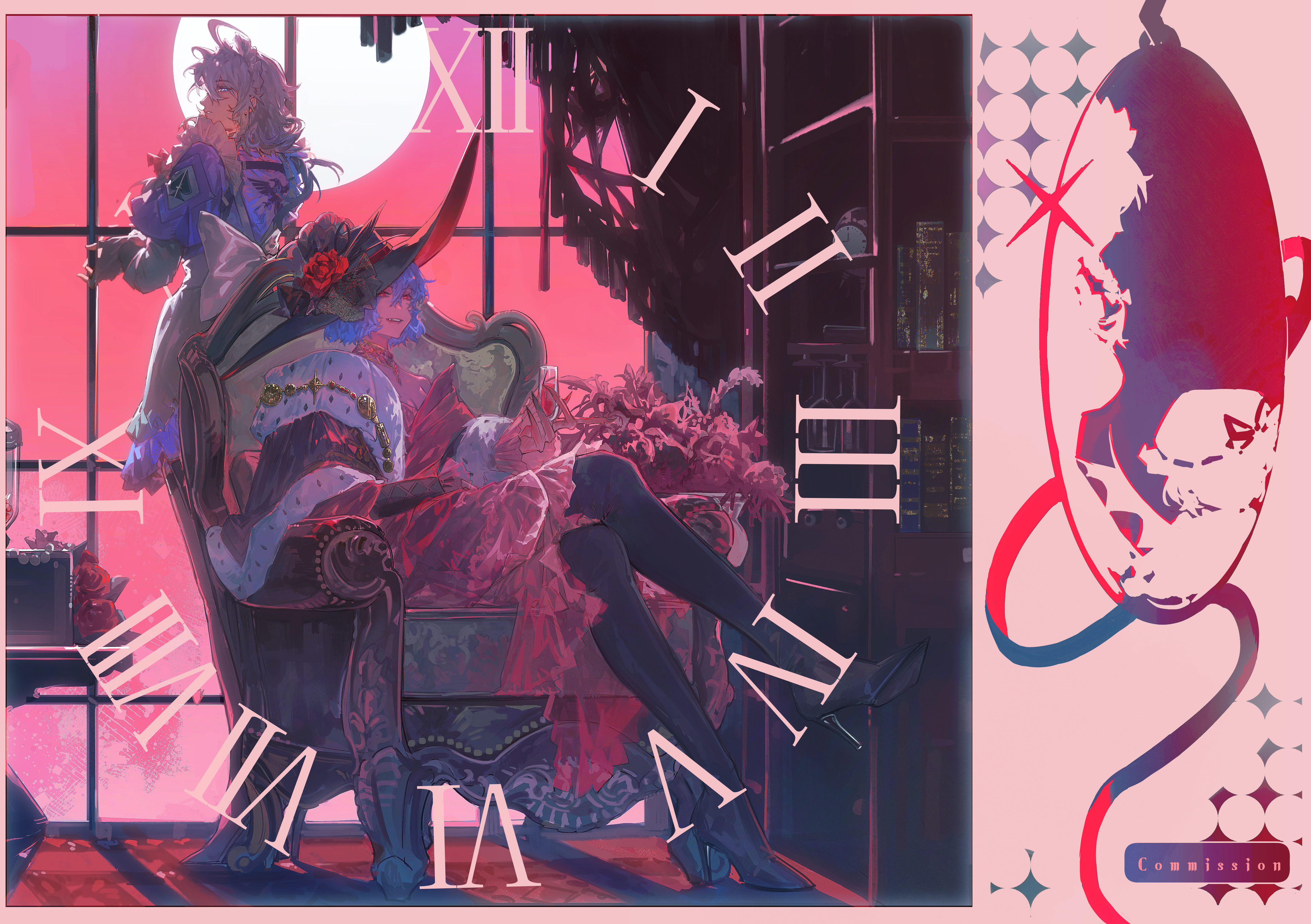 2girls absurdres alternate_costume alternate_headwear apron black_boots black_gloves blue_dress blue_eyes blue_hair boots braid breasts champagne_flute chinese_commentary cleavage commentary_request crossed_legs cup dress drinking_glass fingerless_gloves flower full_moon gloves grey_hair grin hat hat_flower high_heel_boots high_heels highres holding holding_cup izayoi_sakuya long_hair maid_headdress moon multiple_girls pink_dress red_eyes red_flower red_rose red_sky remilia_scarlet roman_numeral rose short_hair sitting sky smile thigh_boots touhou waist_apron white_apron window xiuchundao