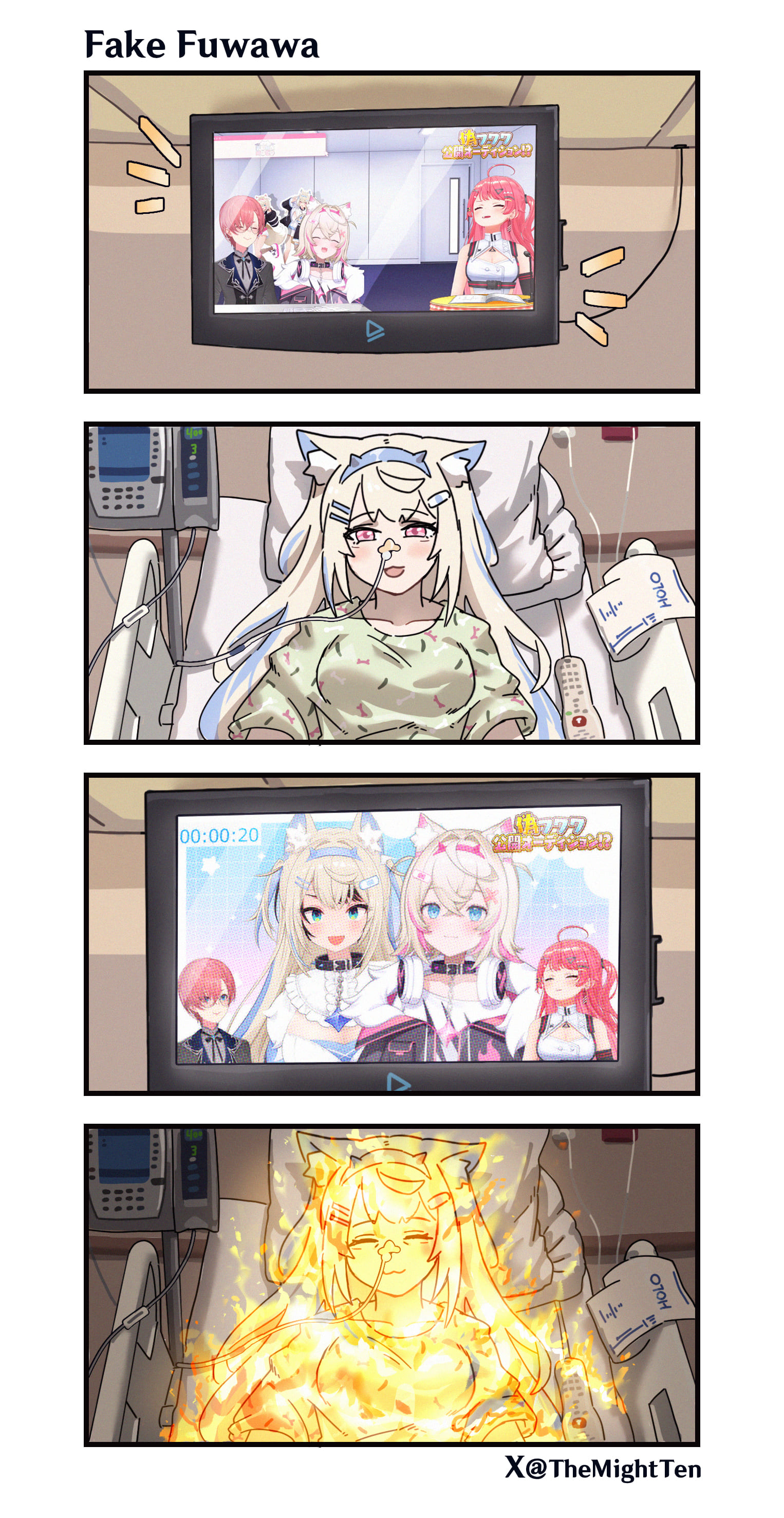 5girls :3 absurdres animal_ears bed bing_huyue blonde_hair blue_hairband blue_streaks burning closed_eyes closed_mouth cosplay dog_ears dog_girl fake_horns fuwawa_abyssgard fuwawa_abyssgard_(1st_costume) fuwawa_abyssgard_(cosplay) hairband highres hololive hololive_english horn_hairband horns hospital hospital_bed hospital_gown long_hair mococo_abyssgard mococo_abyssgard_(1st_costume) multicolored_hair multiple_girls oozora_subaru open_mouth sakura_miko screenshot_inset streaked_hair takane_lui takane_lui_(british_gothic) television twitter_username virtual_youtuber