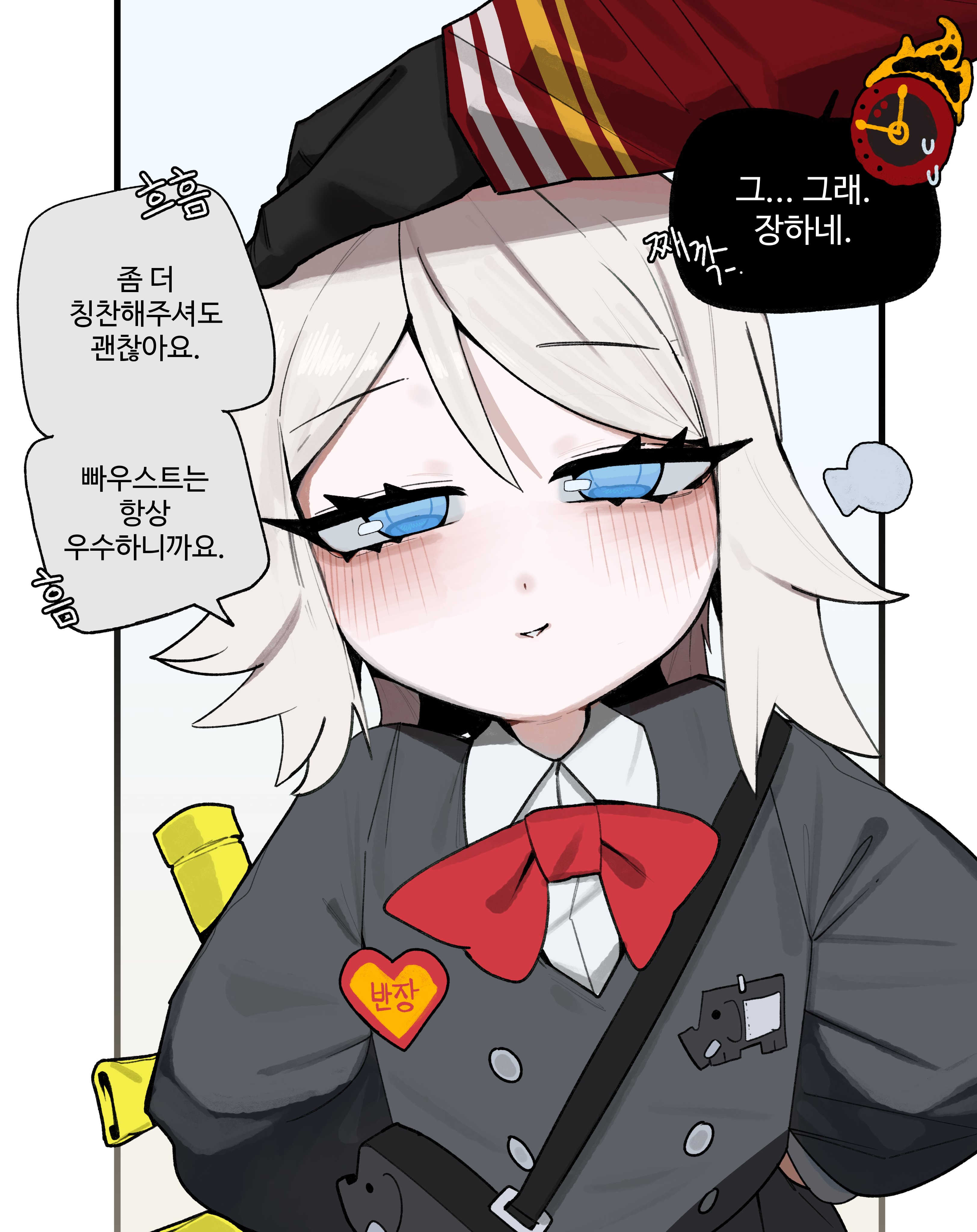 1girl 1other absurdres animal_print arms_behind_back bbizim03 bow bowtie check_translation collared_shirt commentary dante_(limbus_company) elephant faust_(project_moon) headpat heart highres holding holding_sword holding_weapon kindergarten_uniform korean_text limbus_company limbus_kindergarten_uniform official_alternate_costume project_moon red_bow shirt sword traditional_bowtie translation_request weapon white_hair white_shirt