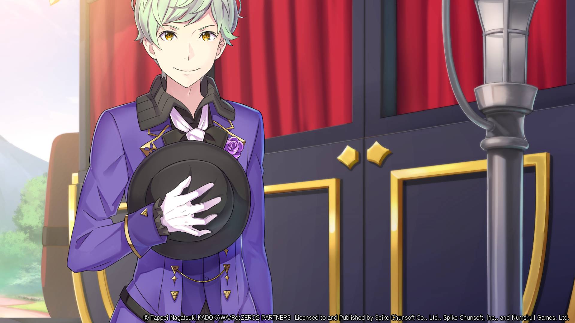 1boy circus fedora flower formal_clothes gloves green_hair hat highres holding looking_at_viewer male_focus necktie official_art purple_flower purple_rose re:zero_kara_hajimeru_isekai_seikatsu rose short_hair smile solo suit tiga_rauleon unworn_hat unworn_headwear wavy_hair white_gloves yellow_eyes