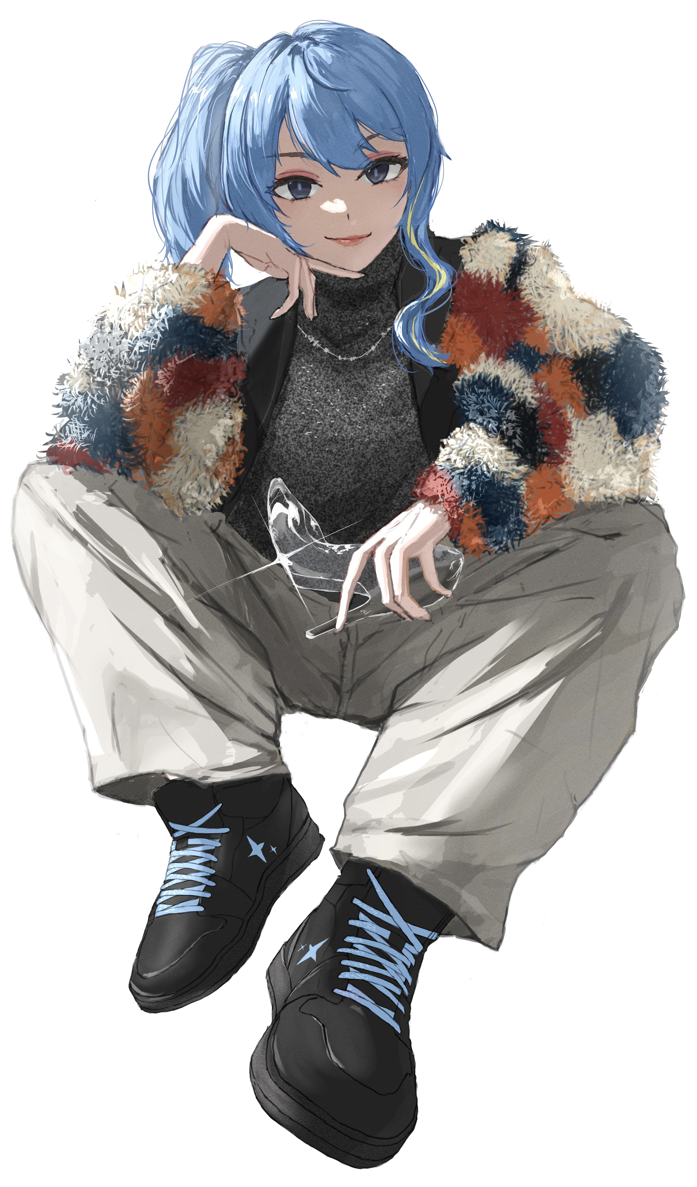 1girl absurdres armald0 bibbidiba_(hololive) blonde_streaks blue_eyes blue_hair commentary glass_slipper highres hololive hoshimachi_suisei long_hair multicolored_hair simple_background solo streaked_hair virtual_youtuber white_background