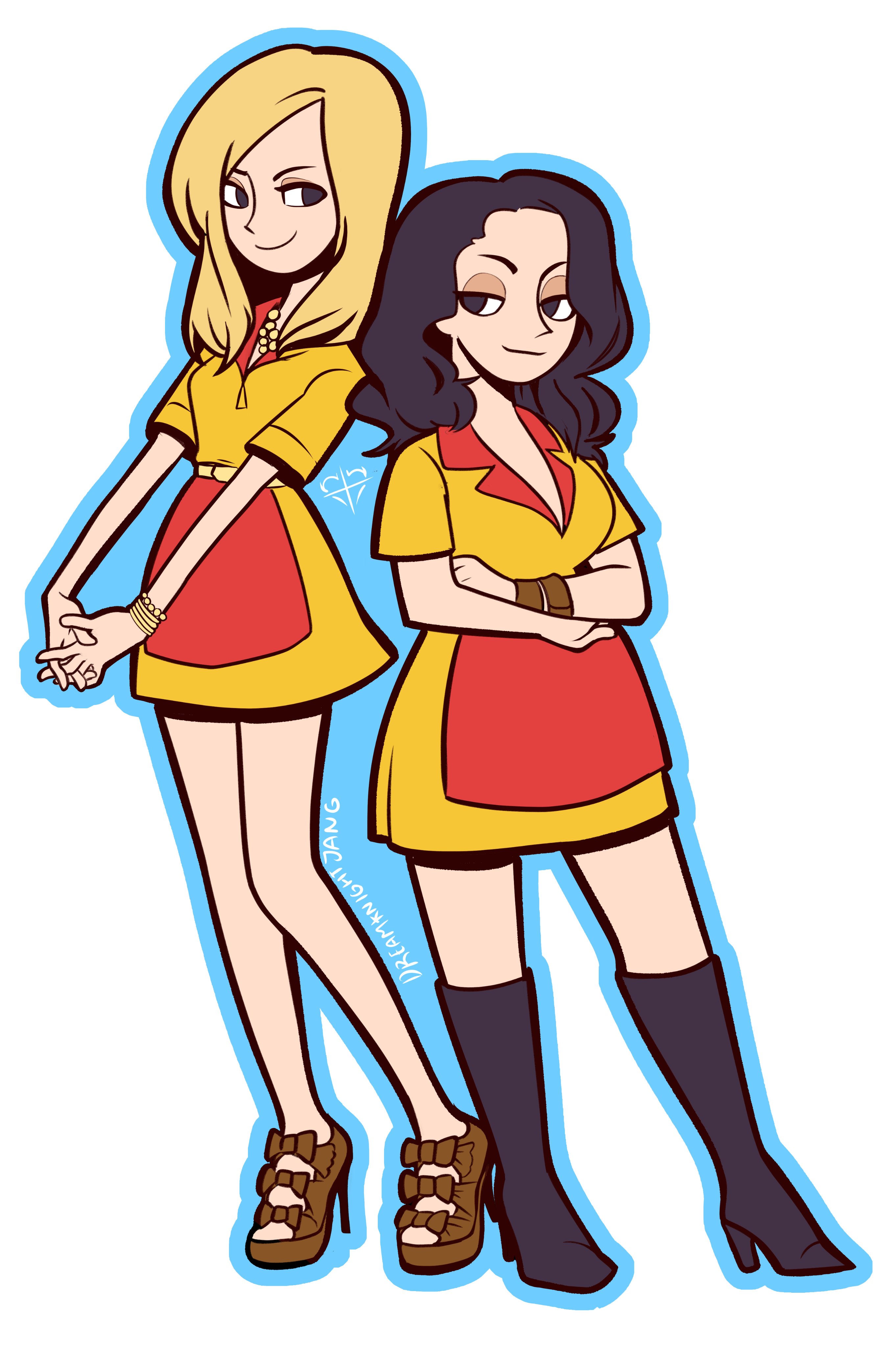 2_broke_girls 2girls apron black_hair blonde_hair breasts caroline_channing dress earrings employee_uniform full_body highres jewelry long_hair looking_at_viewer max_black multiple_girls necklace signature sketchesjang smile toon_(style) waist_apron waitress yellow_dress