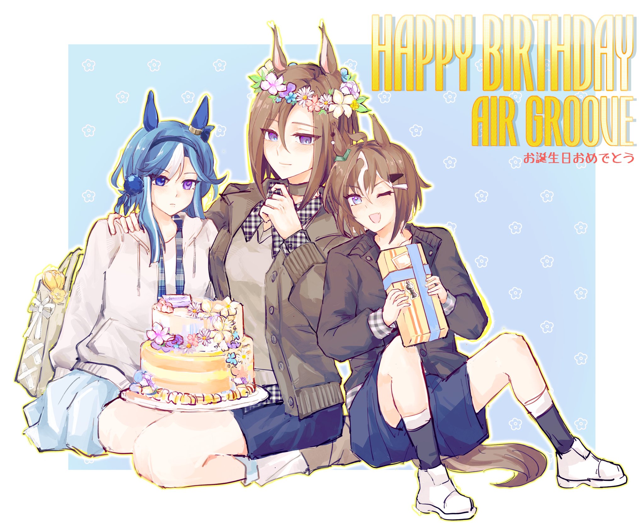 3026233904yin 3girls admire_groove_(umamusume) ahoge air_groove_(umamusume) animal_ears artist_name birthday_cake black_jacket black_socks blue_eyes blue_hair blue_shorts blue_skirt blush breasts brown_hair cake closed_mouth ear_covers flower_wreath food gift grey_jacket grey_sweater hair_between_eyes hair_ornament hair_over_one_eye hairband happy_birthday heterochromia highres holding holding_gift hood hoodie horse_ears horse_girl horse_tail jacket long_hair mole mole_under_mouth multicolored_hair multiple_girls one_eye_closed open_mouth purple_eyes rulership_(umamusume) seiza shirt shoes short_hair shorts sitting skirt smile socks streaked_hair sweater tail tray umamusume umamusume_horse_relations white_hair white_hoodie white_socks