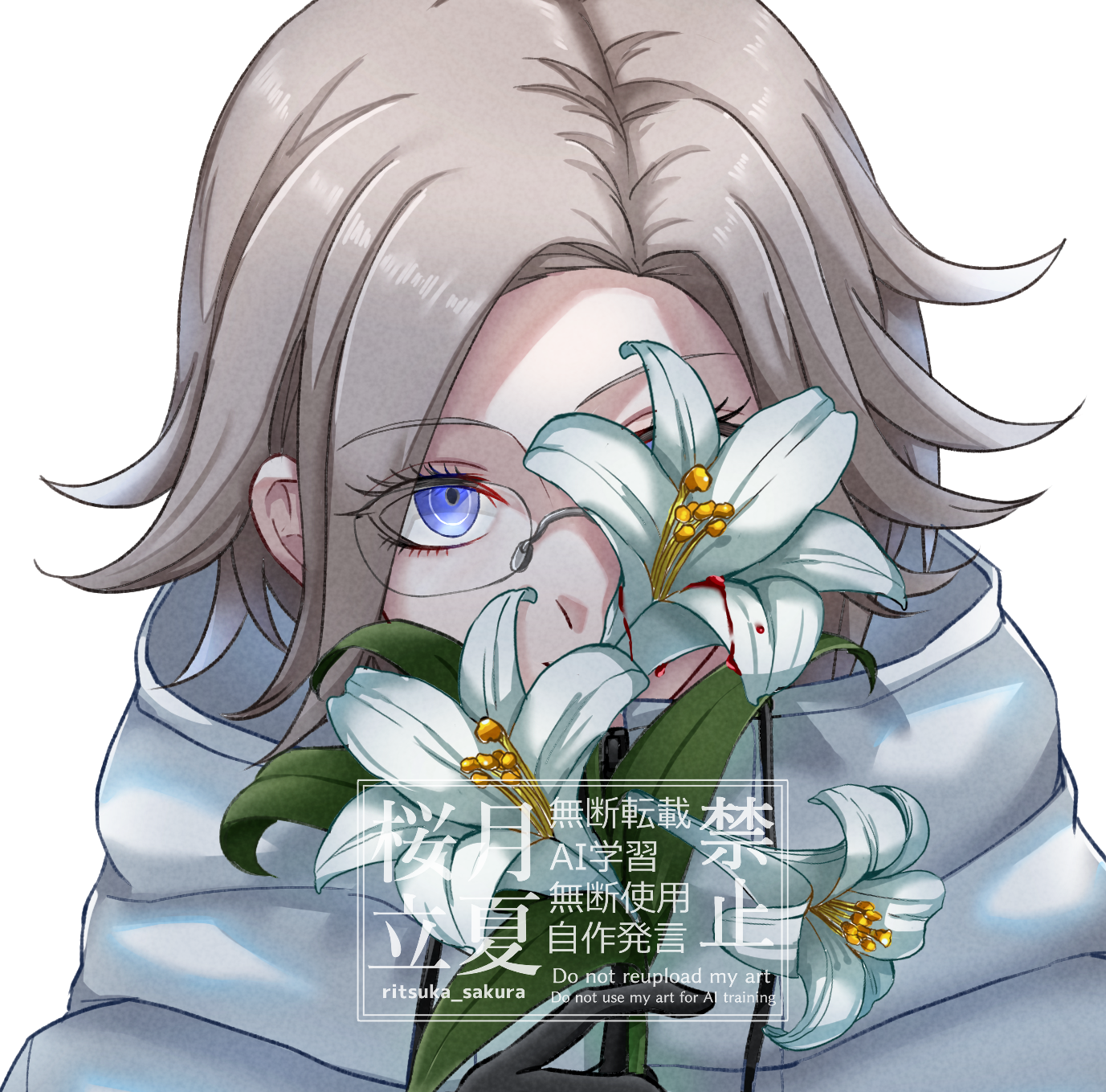 1boy aotsuki_eito black_gloves blood brown_hair commentary_request flower glasses gloves highres holding holding_flower jacket lily_(flower) looking_at_viewer male_focus one_eye_covered portrait purple_eyes ritsuka_sakura short_hair solo the_hundred_line_-last_defense_academy- watermark white_background white_jacket white_lily