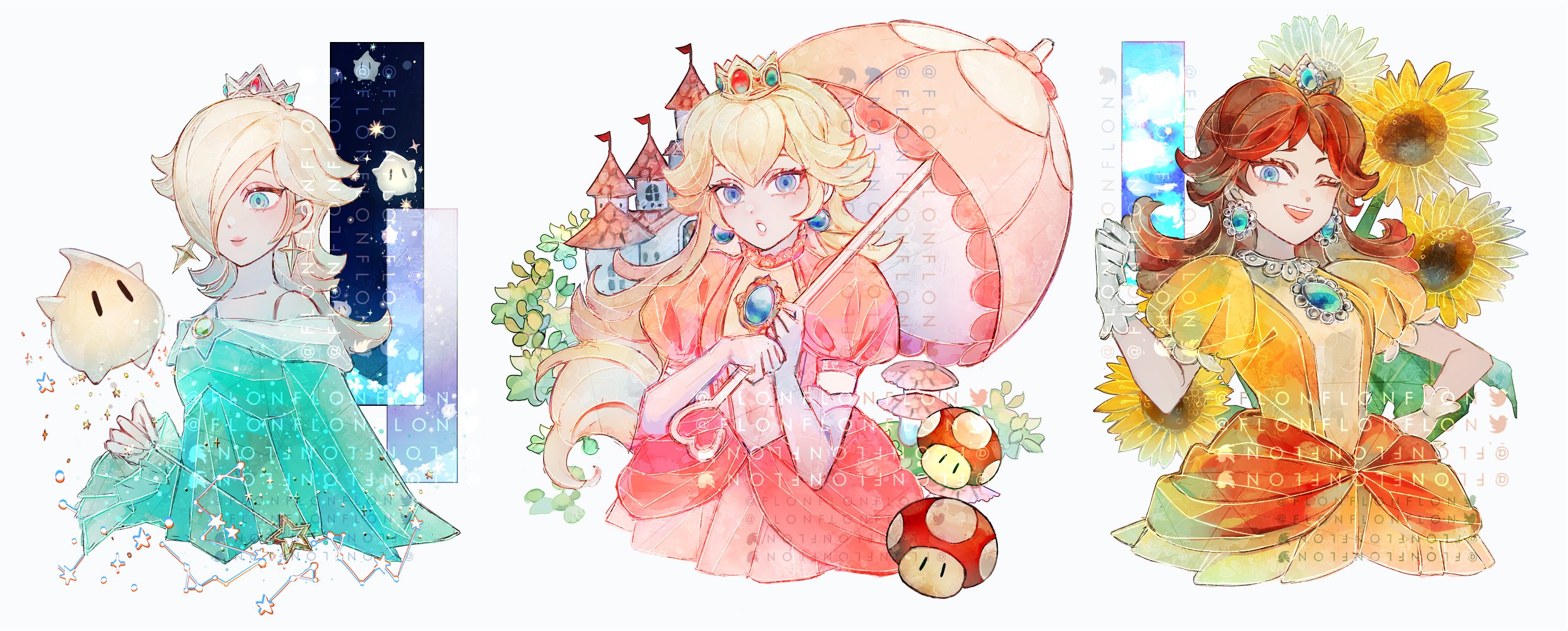 3girls aqua_dress aqua_eyes blonde_hair blue_eyes breasts brown_hair castle chest_jewel closed_mouth cropped_torso crown dress earrings elbow_gloves flonflonflon flower gloves hair_over_one_eye hand_on_own_hip highres holding holding_umbrella jellyfish_cut jewelry long_hair luma_(mario) mario_(series) medium_breasts multiple_girls nintendo off-shoulder_dress off_shoulder one_eye_closed open_mouth parasol parted_lips pink_dress princess_daisy princess_peach puffy_short_sleeves puffy_sleeves rosalina short_sleeves smile sunflower toad_(mario) umbrella upper_body white_gloves