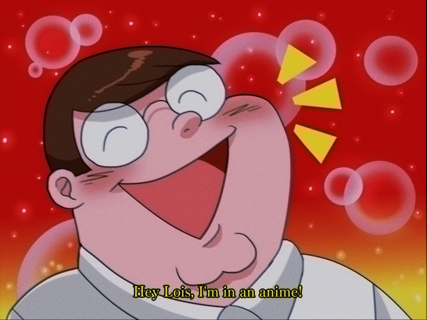 1990s_(style) 1boy :d animification brown_hair cleft_chin closed_eyes collared_shirt doggie358 family_guy glasses male_focus notice_lines open_mouth parody peter_griffin retro_artstyle round_eyewear shirt short_hair smile solo very_short_hair white_shirt