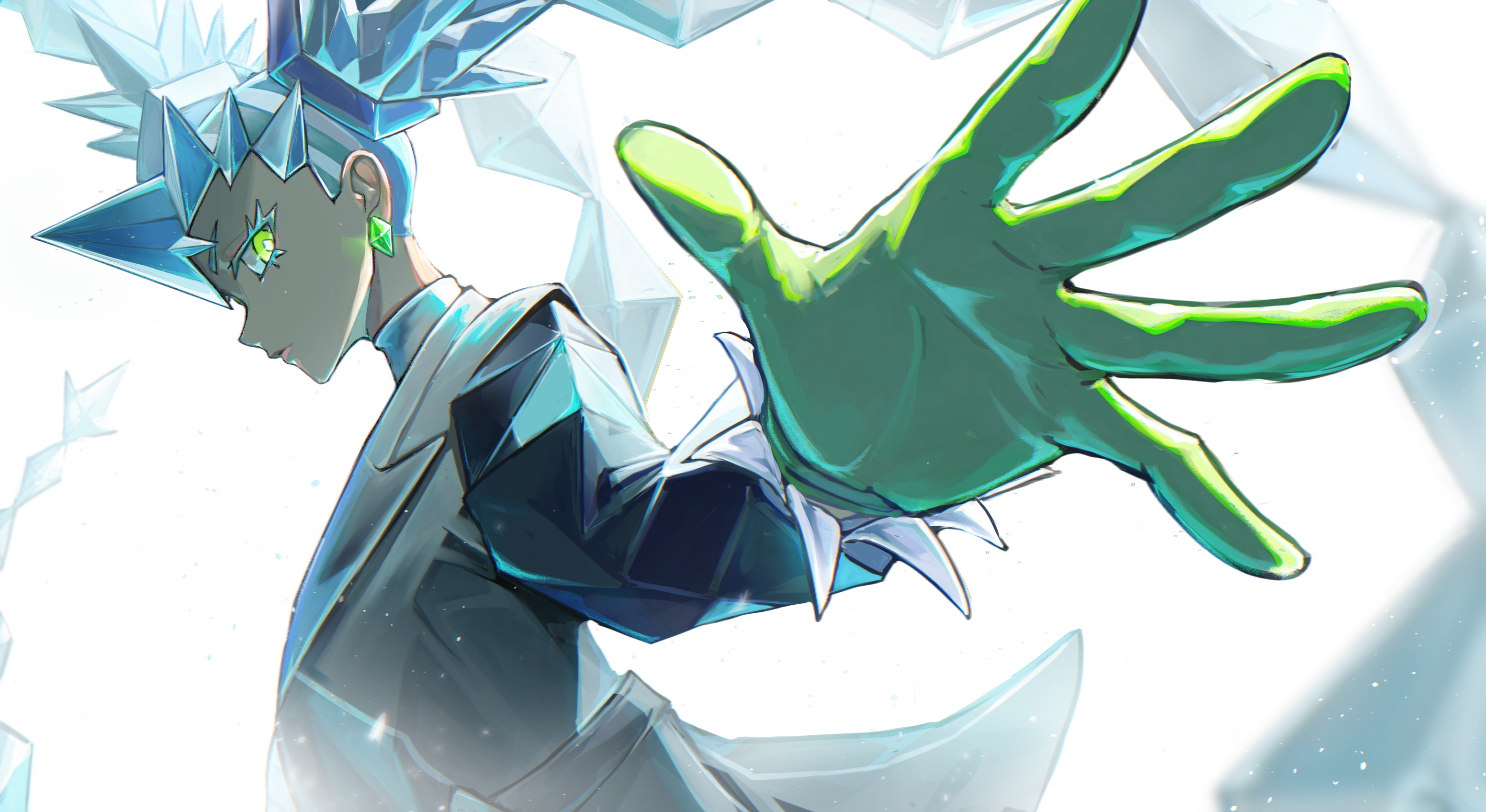 1girl blue_hair bobu_777 closed_mouth diamond_earrings earrings gloves green_eyes green_gloves grey_jacket hair_between_eyes hatsune_miku highres ice_hair ice_miku_(project_voltage) jacket jewelry long_hair long_sleeves nintendo pokemon project_voltage shirt spiked_hair twintails very_long_hair vocaloid white_shirt