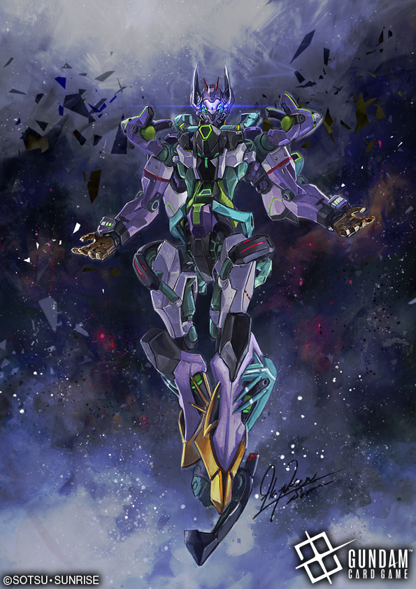 commentary debris english_text gfred gundam gundam_card_game gundam_gquuuuuux hayaken_sarena logo looking_at_viewer mecha mecha_focus mobile_suit nebula no_humans official_art realistic robot science_fiction space star_(sky) starry_sky_background title zeon zero_gravity