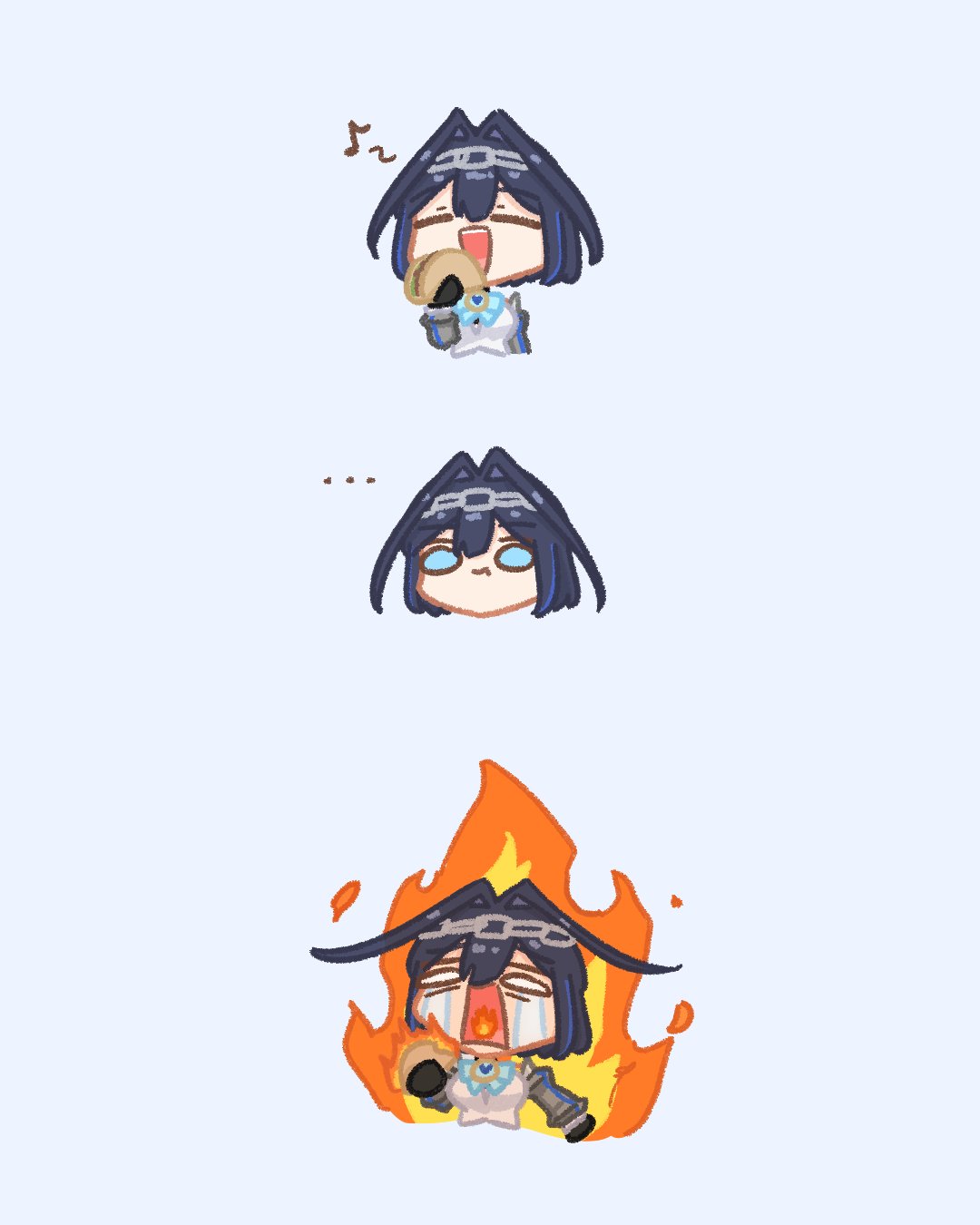 1girl ^_^ blue_eyes blue_hair bow brooch burning chain closed_eyes commentary eating hair_intakes hairband highres hololive hololive_english jewelry medium_hair ouro_kronii ouro_kronii_(1st_costume) sappysque solo spicy taco tears untranslatable_commentary upper_body virtual_youtuber