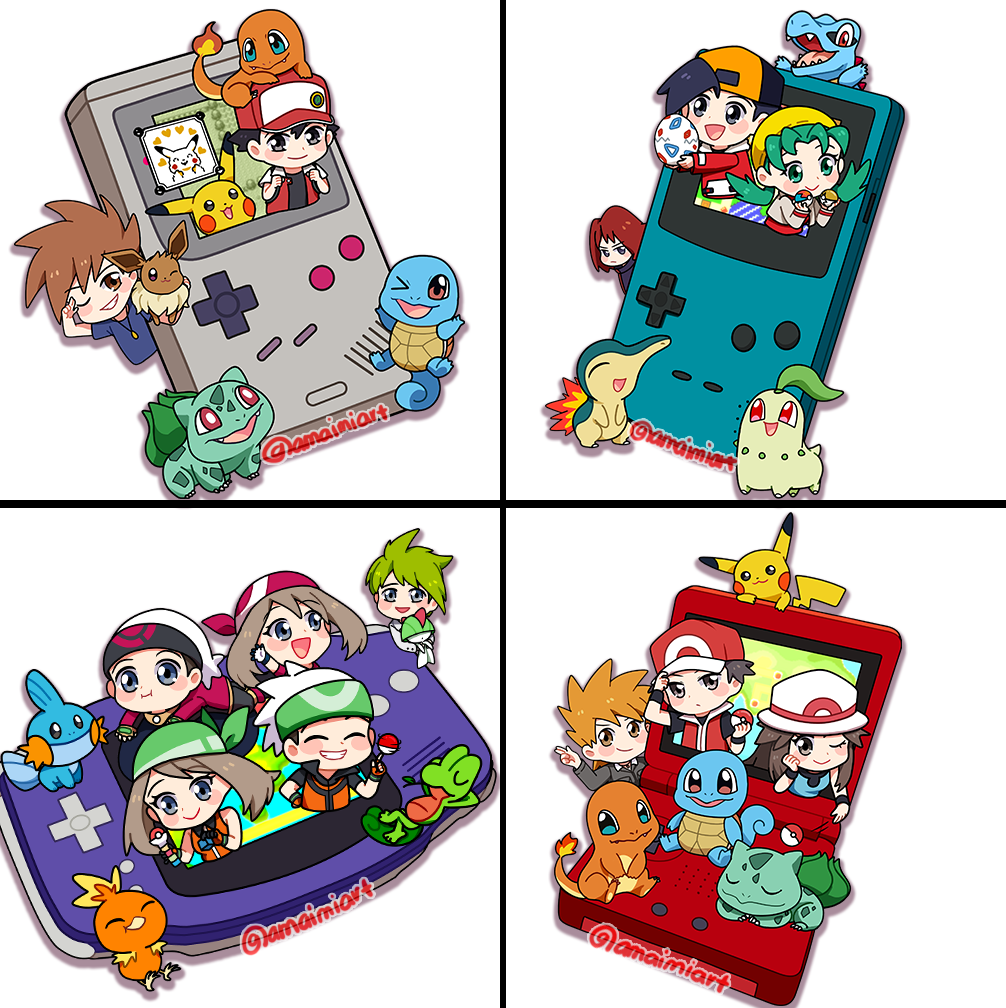 >_o 4girls 6+boys amaimi aqua_eyes aqua_hair aqua_shirt arms_behind_head backwards_hat bandana baseball_cap black_eyes black_hair black_shirt blue_eyes blue_oak blue_shirt blush blush_stickers brendan_(pokemon) bright_pupils brown_eyes brown_hair bulbasaur charmander chibi chibi_only chikorita closed_eyes closed_mouth commentary_request cyndaquil dual_persona eevee egg ethan_(pokemon) eyelashes fangs fire flame-tipped_tail game_boy game_boy_(original) game_boy_advance game_boy_advance_(original) game_boy_advance_sp game_boy_color gen_1_pokemon gen_2_pokemon gen_3_pokemon green_bandana green_eyes green_hair grey_jacket gs_ball hand_on_own_face handheld_game_console hat head_rest holding holding_egg holding_poke_ball holding_pokemon jacket jewelry kris_(pokemon) leaf_(pokemon) long_hair long_sleeves lure_ball may_(pokemon) mudkip multiple_boys multiple_girls necklace nintendo nostrils on_head one_eye_closed open_clothes open_jacket open_mouth orange_shirt pikachu poke_ball poke_ball_(basic) pokeblock pokeblock_case pokemon pokemon_(creature) pokemon_egg pokemon_emerald pokemon_firered_and_leafgreen pokemon_gold/silver/crystal pokemon_on_head pokemon_red/green/blue/yellow pokemon_ruby/sapphire/emerald ralts red_(pokemon) red_bandana red_hair red_hat red_jacket shirt short_hair short_sleeves silver_(pokemon) simple_background smile spiked_hair squirtle starter_pokemon_trio tail through_medium through_screen togepi_egg torchic totodile treecko twintails twitter_username wally_(pokemon) white_background white_hat white_jacket white_pupils yellow_hat
