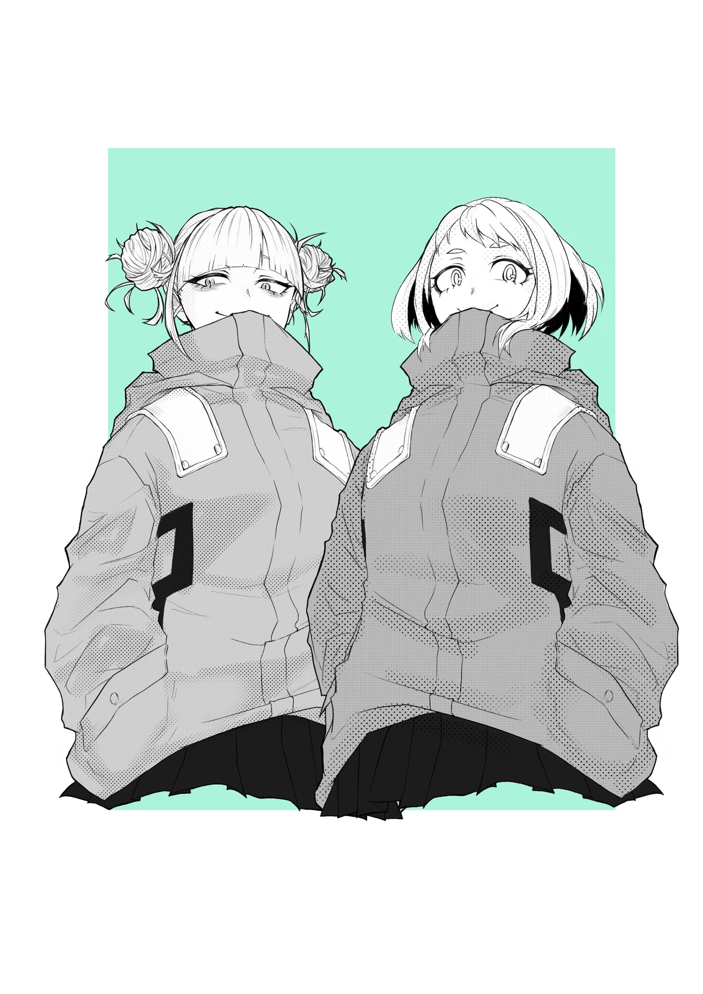 2girls aqua_background bags_under_eyes blunt_bangs boku_no_hero_academia border closed_mouth cowboy_shot cropped_legs double_bun gohanndaisukias hair_bun hand_in_pocket highres looking_at_viewer medium_hair messy_hair monochrome multiple_girls pleated_skirt skirt smile toga_himiko upper_body uraraka_ochako white_border