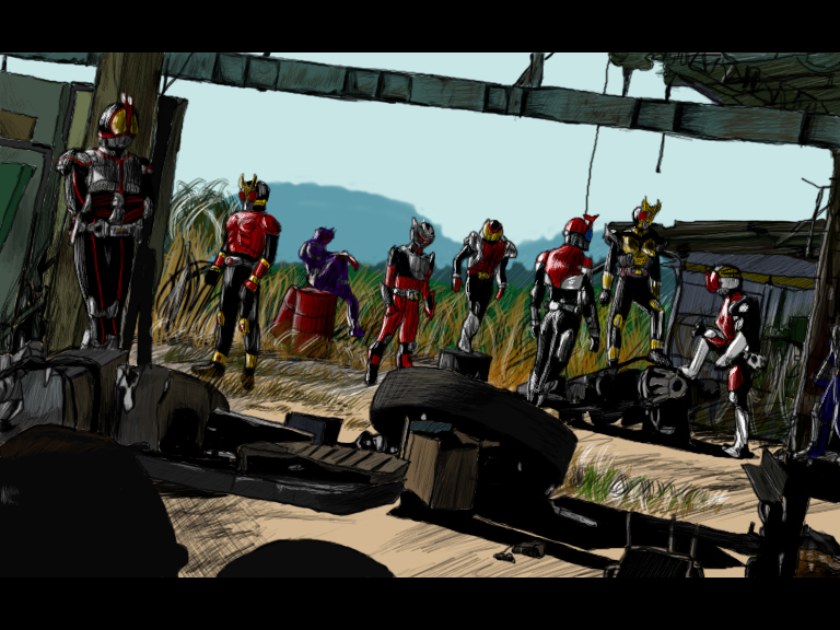 2011 against_wall armor arms_behind_back belt black_border blue_eyes border debris dragon drum_(container) food fruit helmet kamen_rider kamen_rider_555 kamen_rider_agito kamen_rider_agito_(series) kamen_rider_blade kamen_rider_blade_(series) kamen_rider_dcd kamen_rider_den-o kamen_rider_den-o_(series) kamen_rider_faiz kamen_rider_hibiki kamen_rider_hibiki_(series) kamen_rider_kabuto kamen_rider_kabuto_(series) kamen_rider_kiva kamen_rider_kiva_(series) kamen_rider_kuuga kamen_rider_kuuga_(series) kamen_rider_ryuki kamen_rider_ryuki_(series) leg_up male_focus mask masked masked_male motor_vehicle motorcycle multiple_boys peach purple_armor red_armor red_eyes redrawn rhinoceros_beetle scene_reference sitting_on_drum standing_on_object wheel yellow_armor yellow_eyes