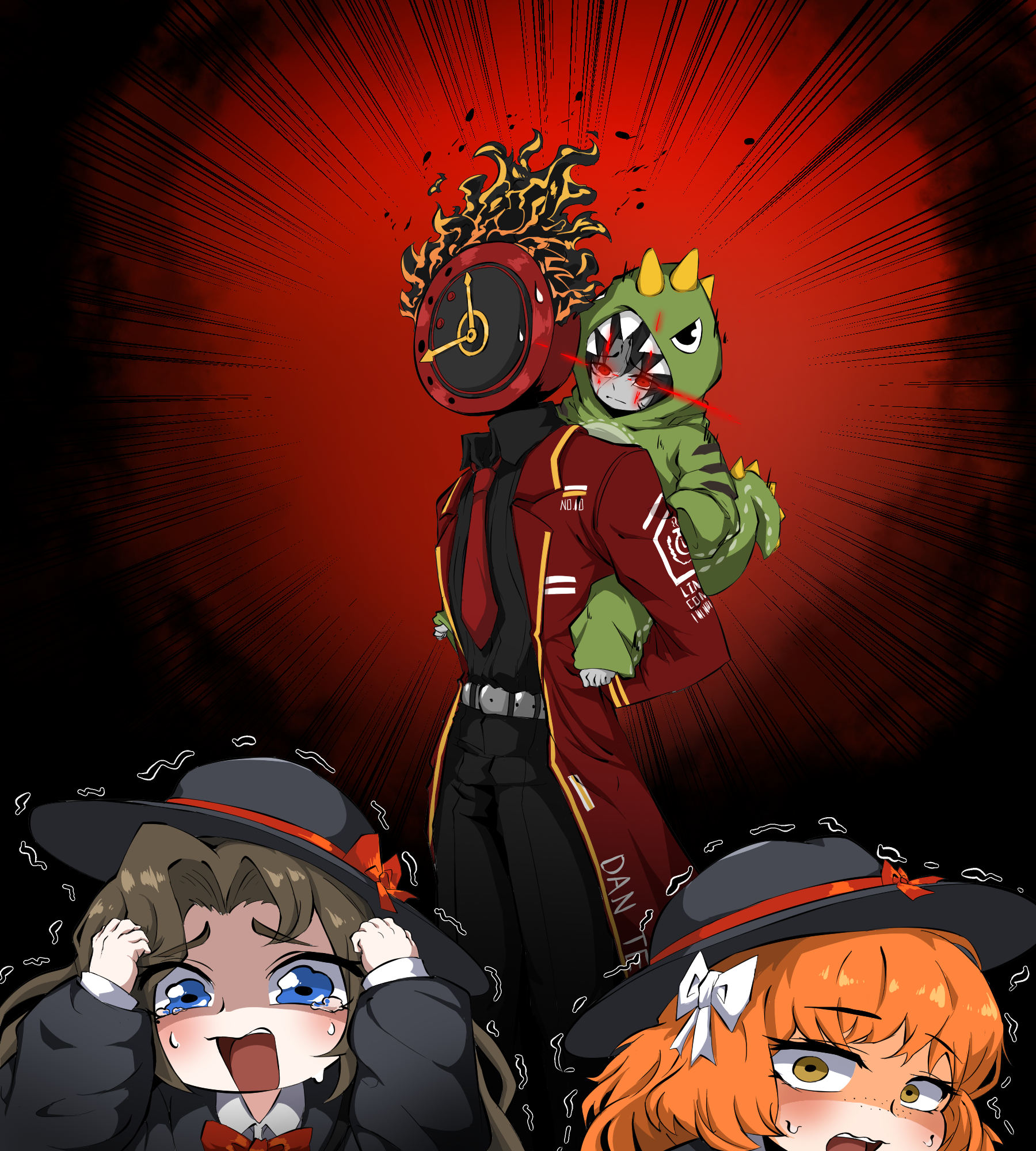 1boy 1other 2girls black_hair black_shirt blue_eyes bow brown_hair carrying clock collared_shirt commentary_request dante_(limbus_company) dinosaur_costume dinosaur_hood dinosaur_tail eye_trail fake_horns fire glowing glowing_eyes hair_ornament hat highres horns ishmael_(project_moon) jungeorl kindergarten_uniform korean_commentary light_trail limbus_company limbus_kindergarten_uniform multiple_girls necktie official_alternate_costume orange_hair piggyback project_moon red_bow red_eyes red_necktie rodion_(project_moon) scared school_hat shirt tail vergilius_(project_moon) white_shirt yellow_eyes