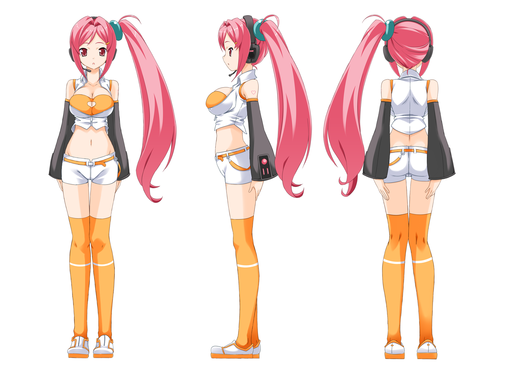 1girl 2000s_(style) arms_at_sides belt black_sleeves breasts cleavage cleavage_cutout clothing_cutout collared_shirt commentary_request detached_sleeves from_behind from_side full_body hair_intakes hair_ornament hairclip headset heart heart_tattoo highres jam_band large_breasts long_hair midriff multiple_views navel official_art orange_belt orange_thighhighs parted_bangs parted_lips pink_eyes pink_hair second-party_source shirt shoes short_shorts shorts shoulder_tattoo side_part side_ponytail standing straight-on tattoo thighhighs transparent_background tsutsumi_kanon umetani_atarou white_shirt white_shoes white_shorts
