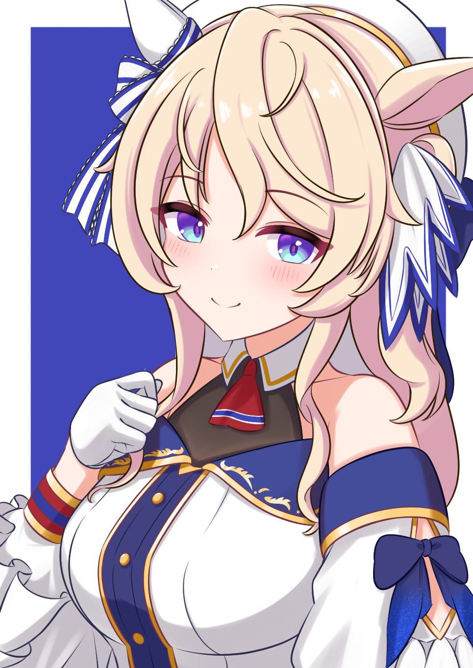 1girl animal_ears bare_shoulders blonde_hair blue_background blue_eyes bow breasts closed_mouth collared_halterneck detached_sleeves ear_covers ear_ribbon gloves hair_ornament highres horse_ears horse_girl makarun_sky mismatched_ear_covers multicolored_eyes outside_border purple_eyes sidelocks single_ear_cover smile solo two-tone_background two-tone_eyes umamusume upper_body victoire_pisa_(lueur_angelique)_(umamusume) victoire_pisa_(umamusume) white_background white_gloves white_sleeves