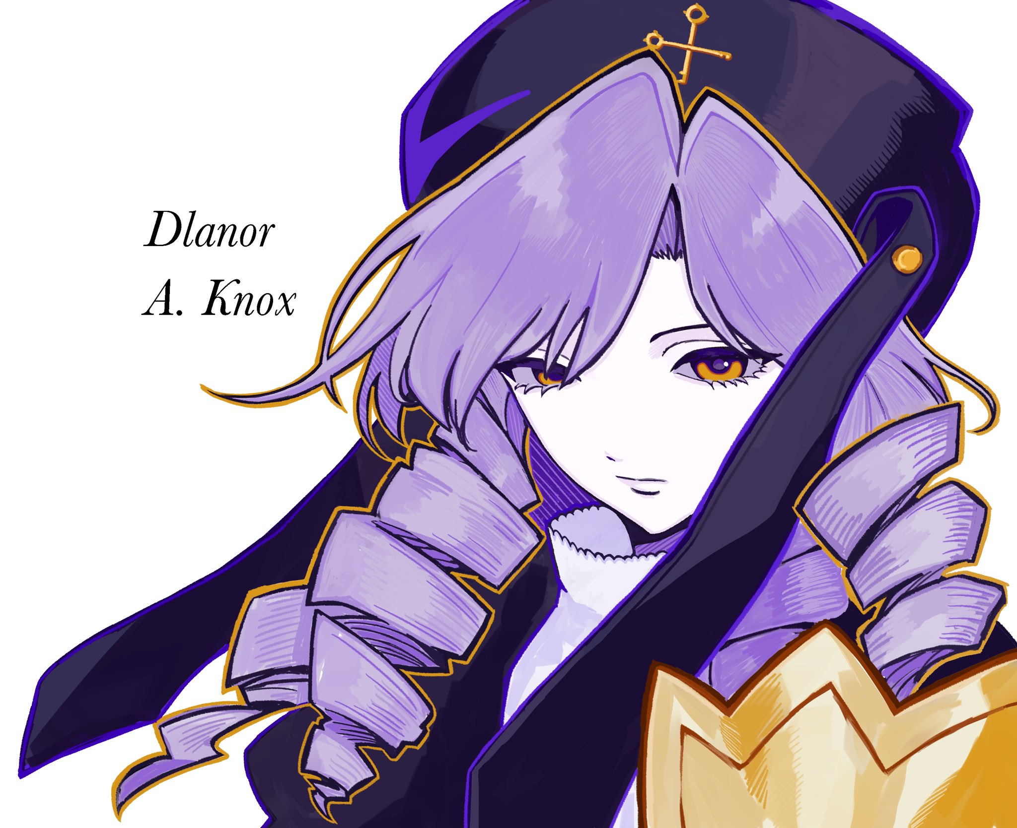 1girl black_hat character_name commentary dlanor_a._knox drill_hair expressionless hat highres orange_eyes portrait purple_hair ryunzzok2 simple_background solo umineko_no_naku_koro_ni white_background