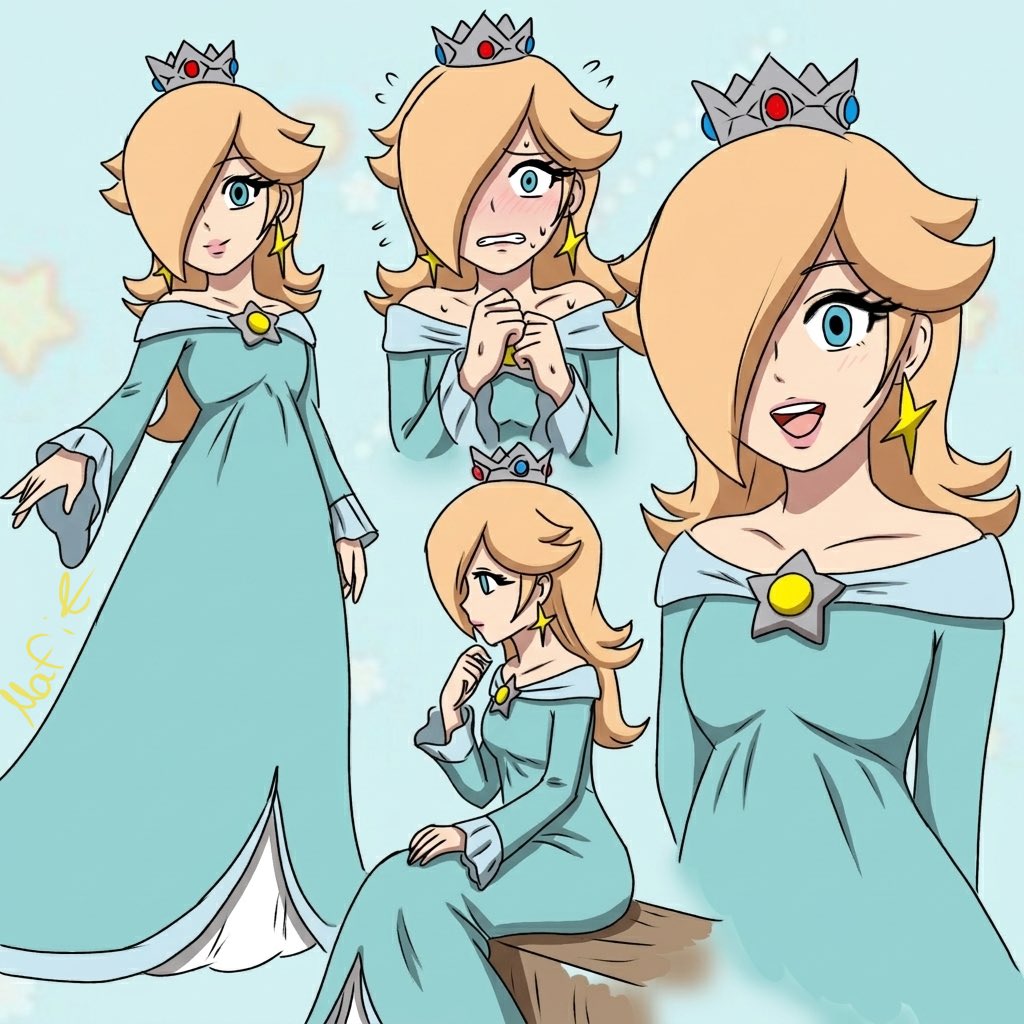 1girl :d artist_name bare_shoulders blonde_hair blue_background blue_dress blue_eyes blush brooch clenched_hands closed_mouth commentary crown dress earrings eyelashes hair_over_one_eye jewelry long_hair long_sleeves looking_at_viewer mafi_(mar_spider) mario_(series) multiple_views nintendo off-shoulder_dress off_shoulder open_mouth rosalina sitting smile star_(symbol) star_brooch star_earrings sweat teeth worried