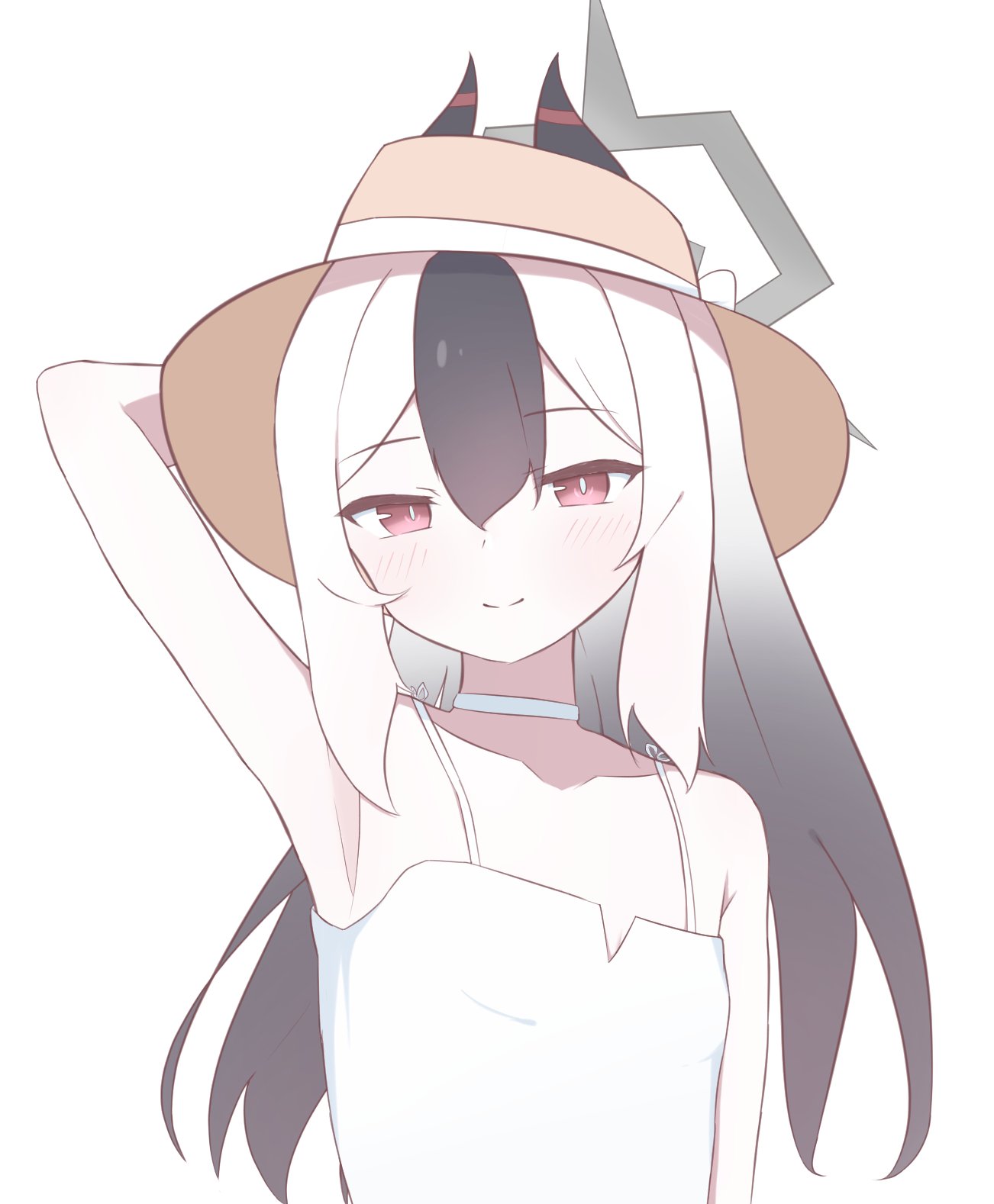 1girl akuku_e armpits blue_archive blush choker commentary_request dress halo hat highres horns kayoko_(blue_archive) light_smile looking_at_viewer solo sundress white_background white_choker white_hair
