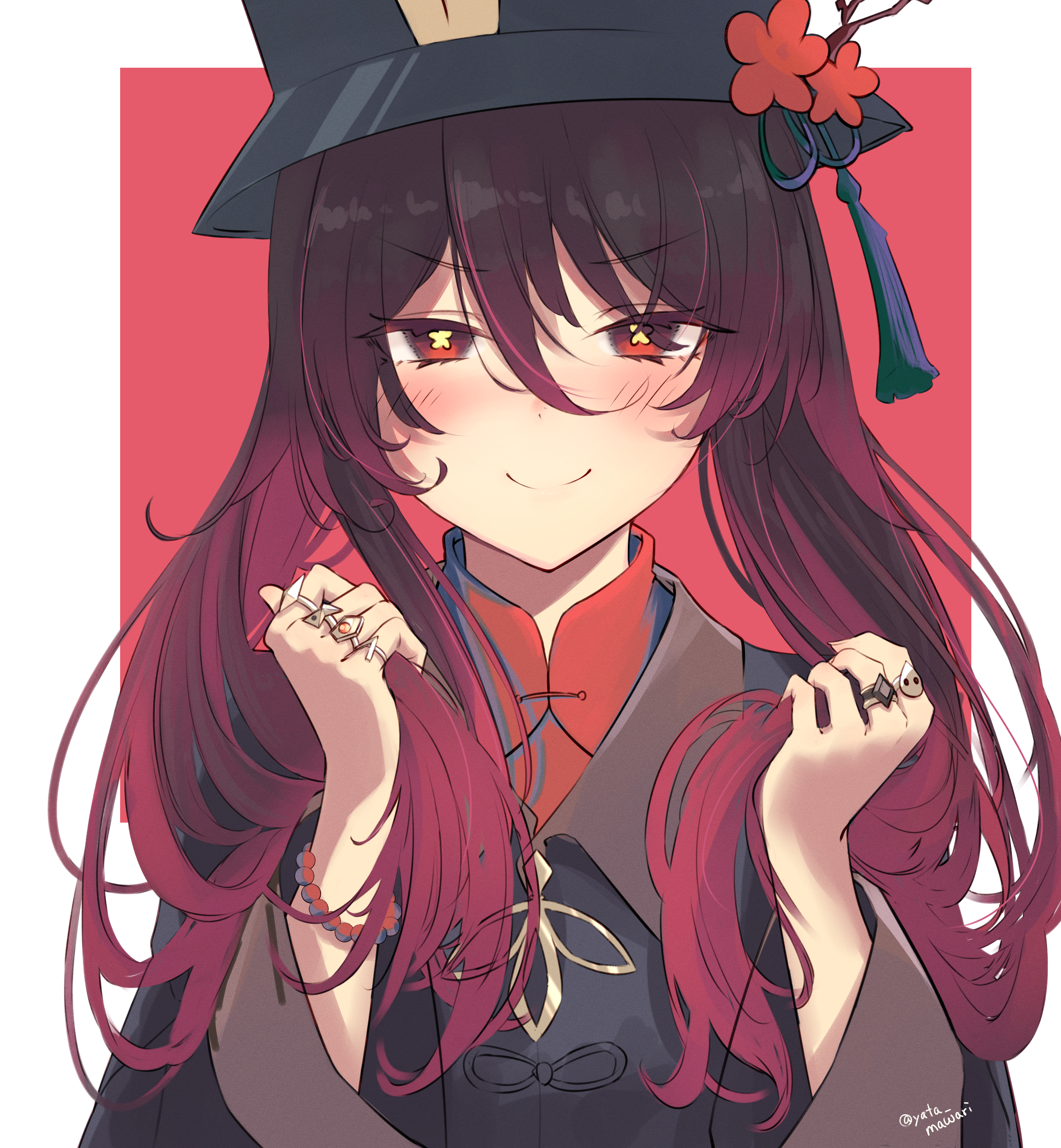 1girl absurdres bead_bracelet beads black_hat blush bracelet brown_hair commentary_request facing_viewer genshin_impact hair_between_eyes hat highres holding_own_hair hu_tao_(genshin_impact) jewelry long_hair looking_at_viewer multiple_rings outside_border red_background red_eyes red_hair ring smile symbol-shaped_pupils tassel twitter_username wide_sleeves yata_mawari