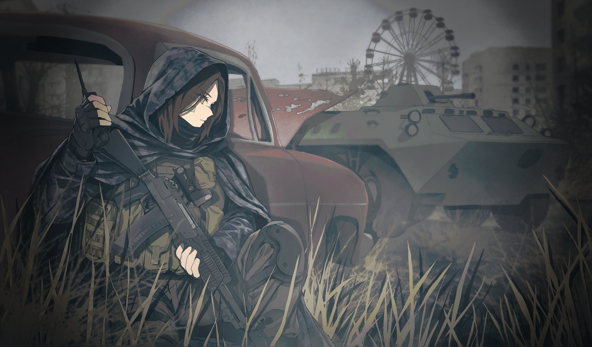 an-94 armored_personnel_carrier armored_vehicle assault_rifle black_gloves brown_hair building bulletproof_vest camouflage_cloak closed_mouth commentary commission english_commentary ferris_wheel fingerless_gloves gauze gauze_on_cheek gloves grass grey_sky gun highres holding holding_gun holding_walkie-talkie holding_weapon maxturbo69 motor_vehicle original pripyat rifle sky walkie-talkie weapon