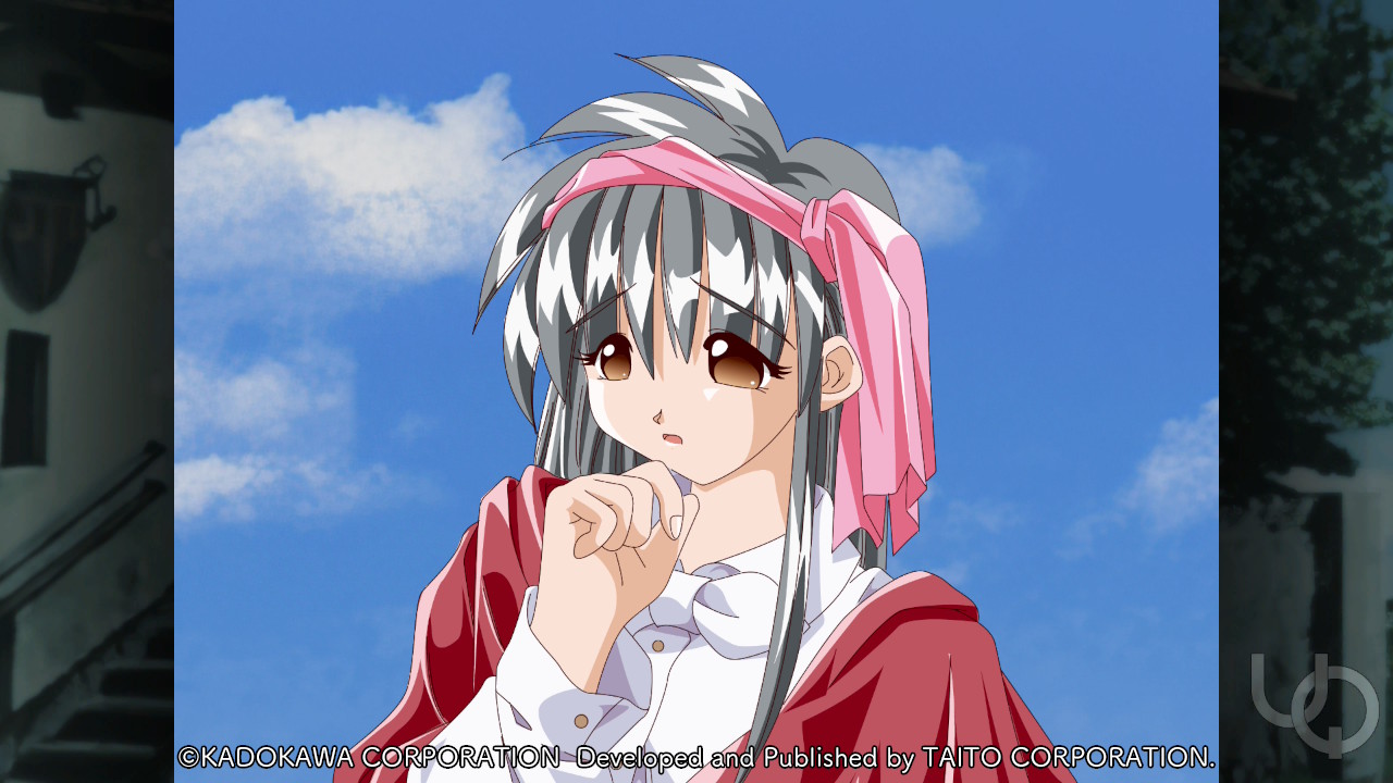 1girl 2000s_(style) ahoge anime_coloring atelier-moo black_hair breasts brown_eyes collared_shirt game_cg hair_ribbon half-closed_eyes large_variant_set long_hair long_sidelocks long_sleeves medium_breasts non-web_source official_art parted_lips pink_ribbon raised_inner_eyebrows red_shawl ribbon shawl sheela_sheffield shirt sidelocks sky solo standing upper_body variant_set white_shirt yuukyuu_gensoukyoku