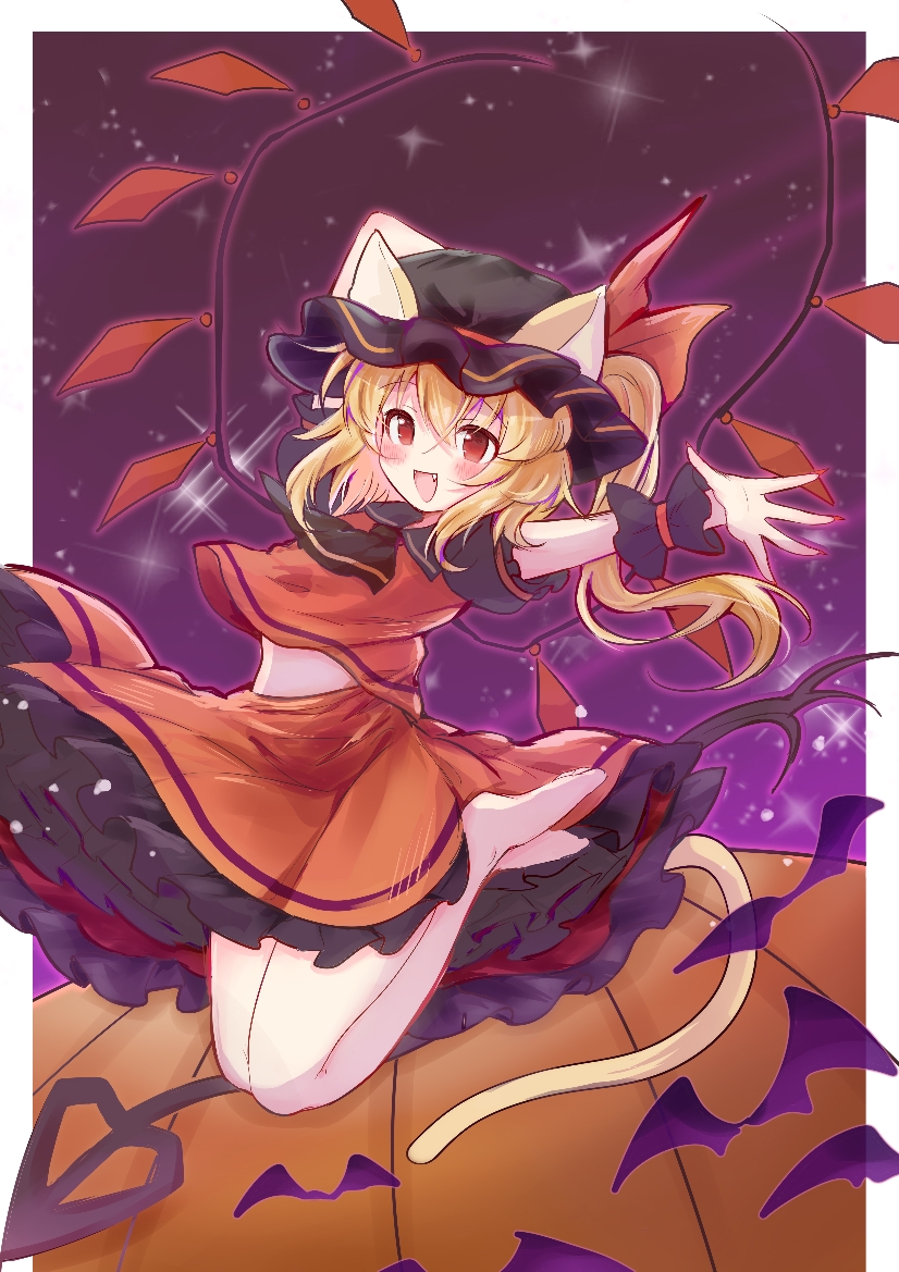 1girl alternate_color animal_ears ascot banfen_mocha_mashu barefoot bat_(animal) black_hat blonde_hair blush cat_ears cat_girl cat_tail chinese_commentary commentary_request crystal crystal_wings fang flandre_scarlet frilled_skirt frills full_body halloween halloween_costume hat laevatein_(touhou) long_hair looking_at_viewer mob_cap open_mouth orange_skirt orange_vest puffy_short_sleeves puffy_sleeves pumpkin red_eyes short_sleeves skirt skirt_set smile solo tail touhou vest wings wrist_cuffs