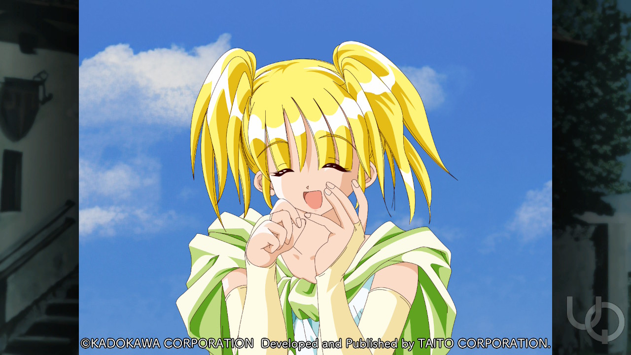 1girl 2000s_(style) :d ^_^ anime_coloring atelier-moo blonde_hair breasts bridal_gauntlets capelet closed_eyes collarbone elbow_gloves game_cg gloves green_capelet hair_between_eyes large_variant_set maria_short medium_hair non-web_source official_art open_mouth shirt short_twintails sky small_breasts smile solo standing twintails upper_body variant_set yellow_gloves yuukyuu_gensoukyoku