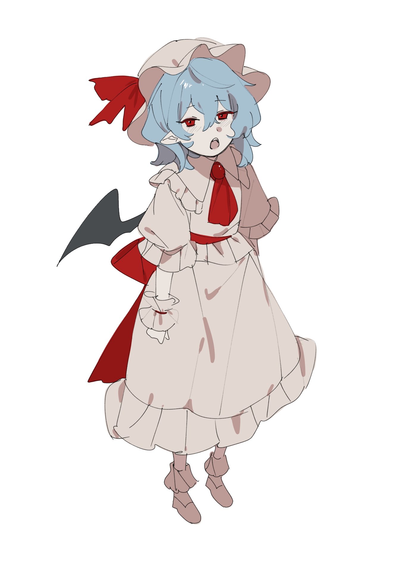 1girl ascot back_bow bat_wings blue_hair bow collared_shirt commentary_request frilled_shirt_collar frills full_body hat hat_ribbon highres hua88331 medium_hair mob_cap open_mouth pink_hat pink_shirt pink_skirt pointy_ears puffy_short_sleeves puffy_sleeves red_ascot red_bow red_eyes remilia_scarlet ribbon shirt short_sleeves simple_background skirt skirt_set solo touhou white_background wings wrist_cuffs