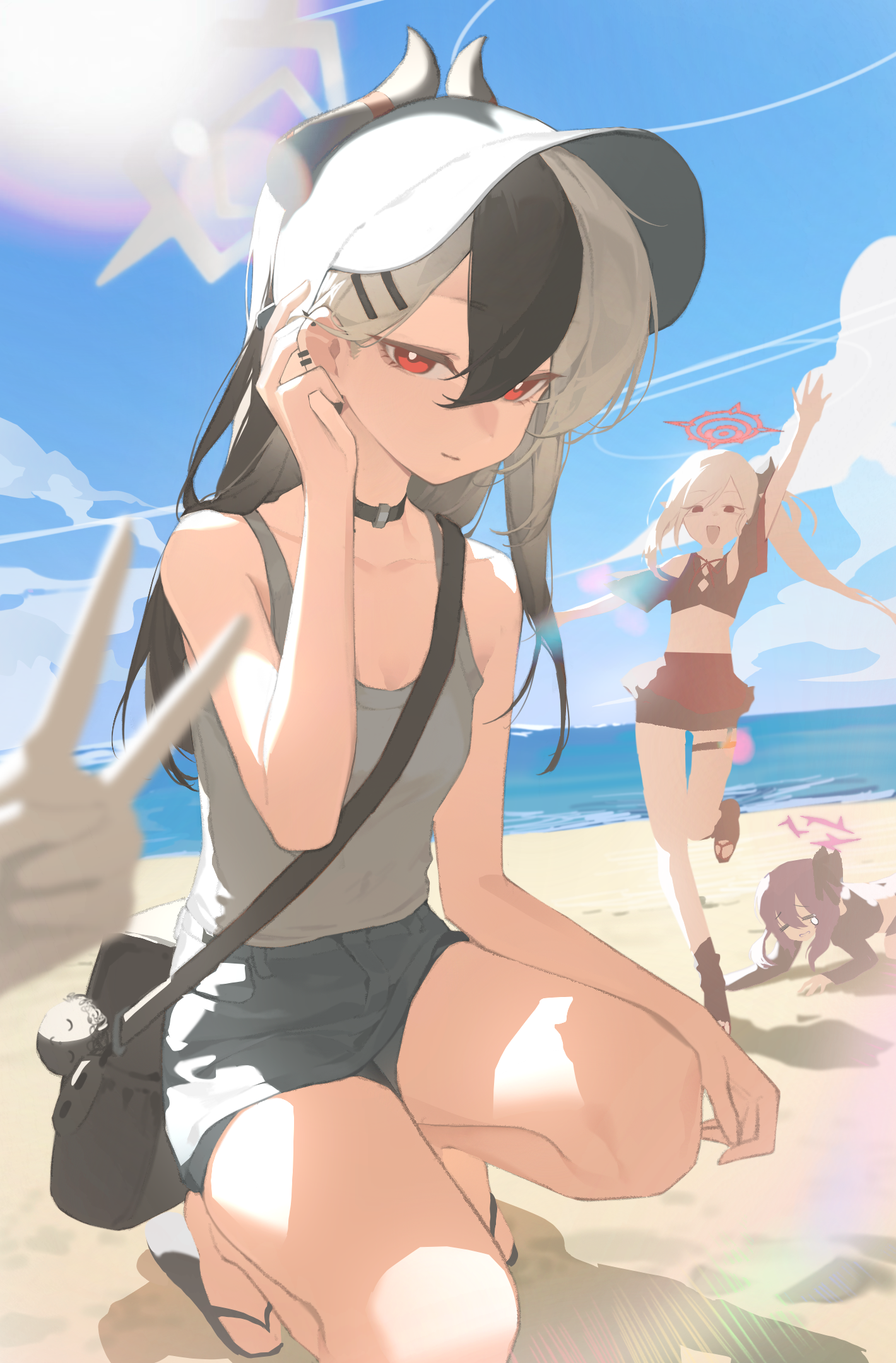 3girls bag bare_arms bare_legs bare_shoulders blue_archive blurry blurry_foreground chinese_commentary choker commentary_request grey_hair hair_ornament halo haruka_(blue_archive) highres horns kayoko_(blue_archive) multiple_girls mutsuki_(blue_archive) purple_hair purple_halo red_hair red_halo shoulder_bag skirt solo_focus swimsuit vest white_hair ye_song yellow_halo