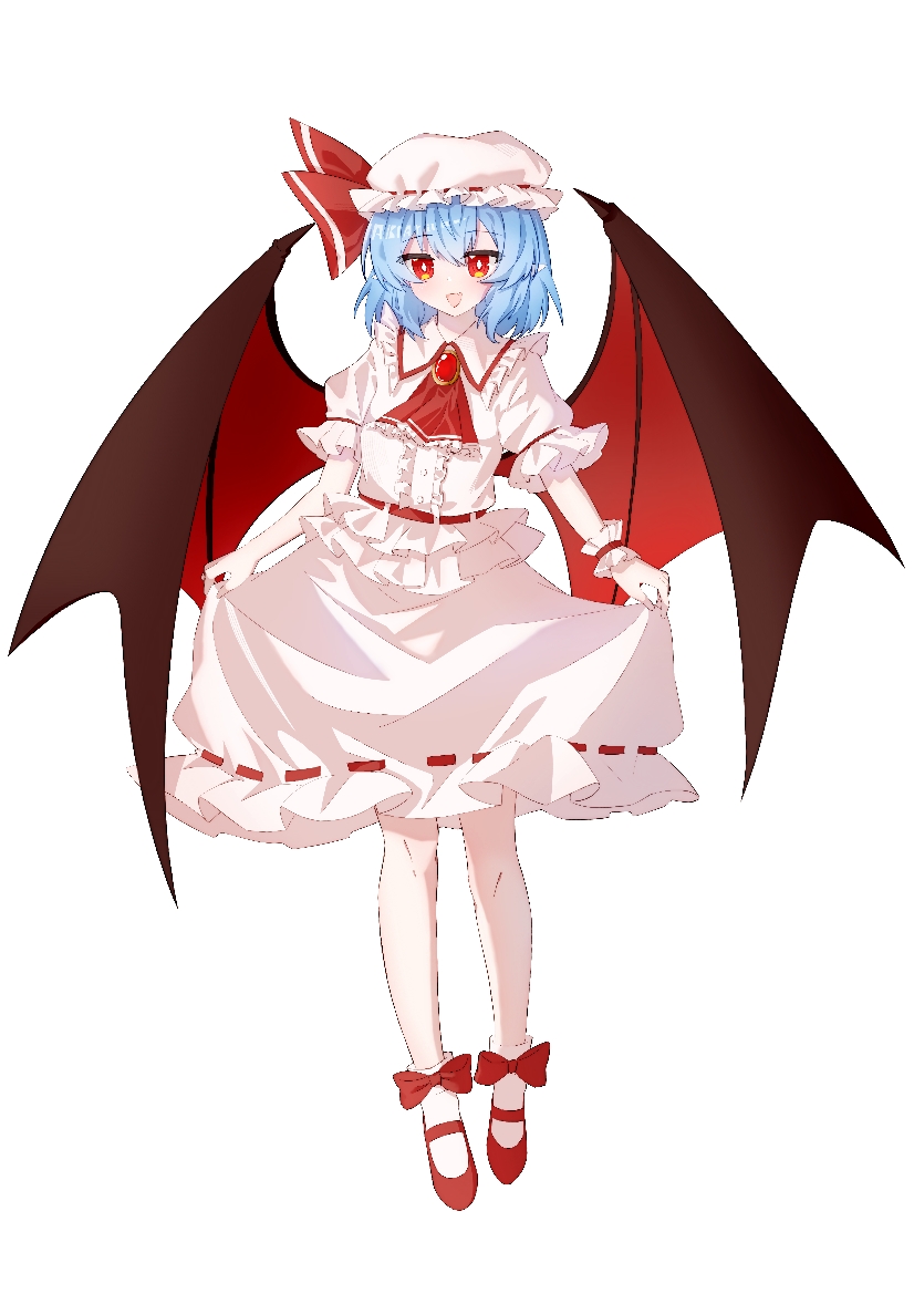 1girl ascot bat_wings blue_hair brooch collared_shirt commentary_request frilled_shirt_collar frills full_body hat hat_ribbon holding_own_skirt jewelry looking_at_viewer medium_hair mob_cap open_mouth pink_hat pink_shirt pink_skirt pointy_ears puffy_short_sleeves puffy_sleeves red_ascot red_eyes red_shoes remilia_scarlet ribbon ribbon-trimmed_skirt ribbon_trim shirt shoes short_sleeves skirt skirt_set smile solo touhou wings wraithakari wrist_cuffs
