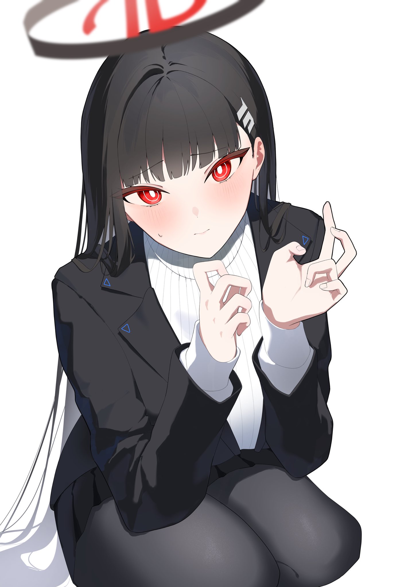 1girl black_hair black_jacket black_pantyhose blazer blue_archive blunt_bangs blush commentary_request halo highres jacket long_hair looking_at_viewer pantyhose red_eyes rio_(blue_archive) school_uniform simple_background sitting smile solo sukasusu_51te turtleneck v white_background white_turtleneck