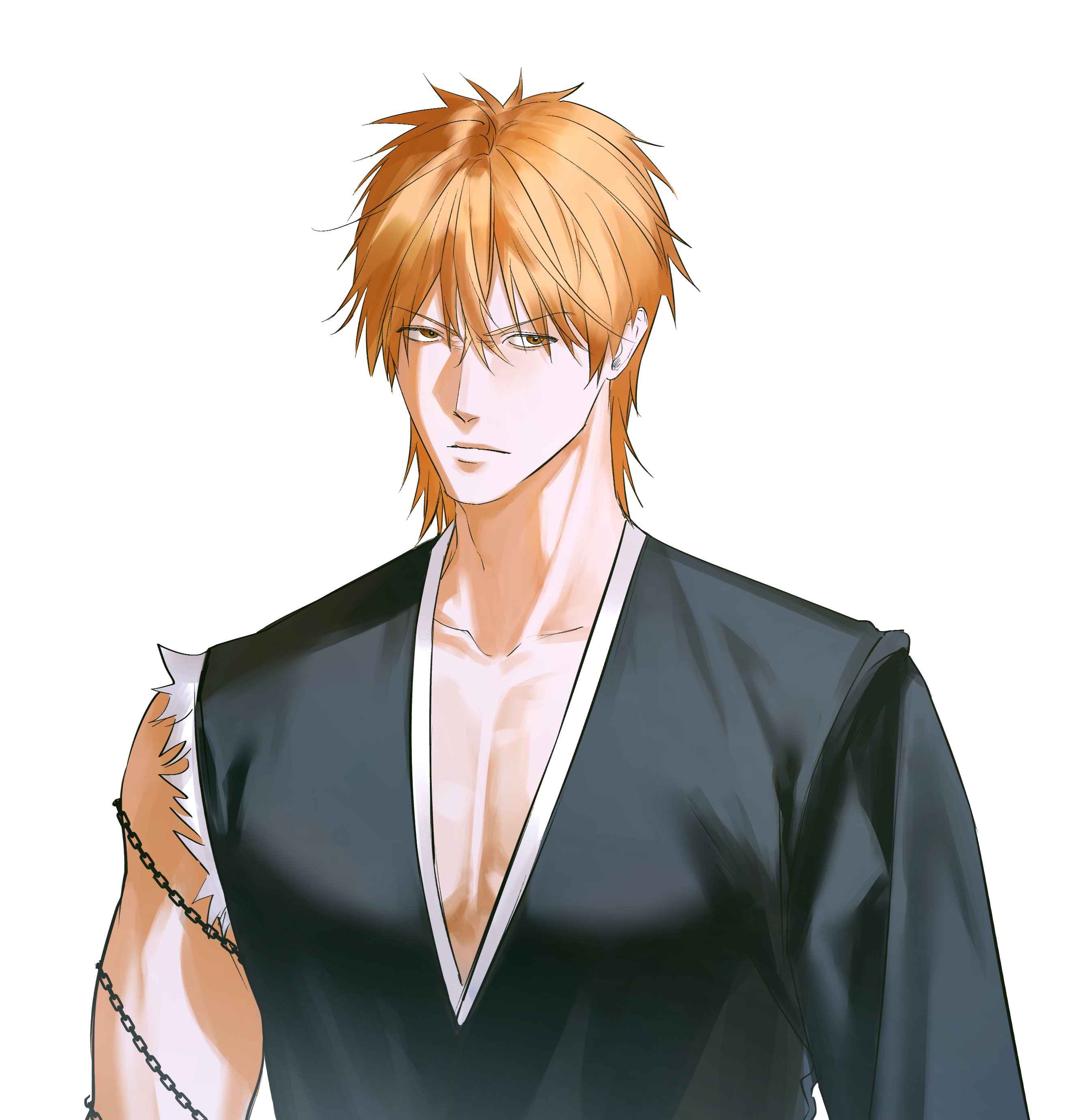 1boy absurdres bleach closed_mouth collarbone commentary highres kurosaki_ichigo looking_at_viewer male_focus orange_hair pectoral_cleavage pectorals shihakusho short_hair simple_background solo torn_clothes upper_body white_background xatavo9919